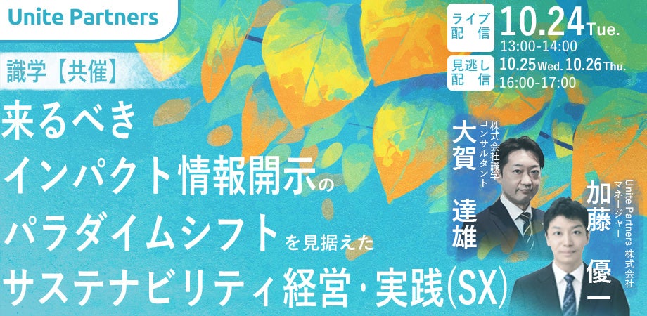 企業の変革パートナーを目指すブティック型コンサルティングファームのUnite Partners株式会社(本社:東京都、代表取締役:小林大輝)は、2023年10/24~26 に、「来るべきインパクト情報開示のパラダイムシフトを見据えたサステナビリティ経営・実践(SX)」と題して大企業の経営幹部の方向けのセミナーを開催します。