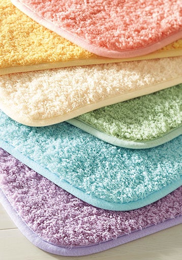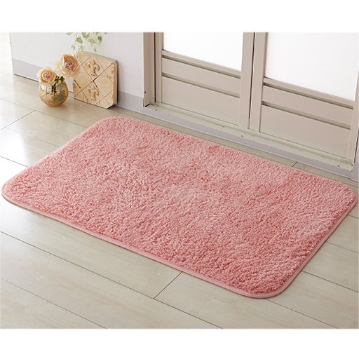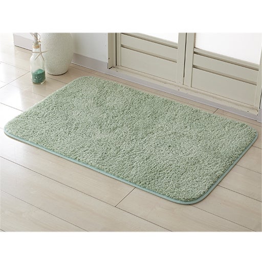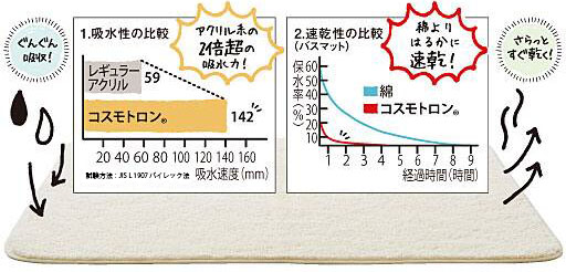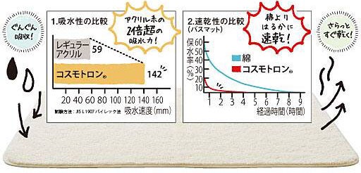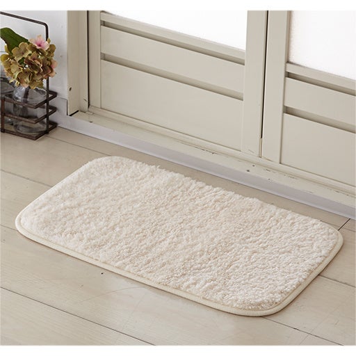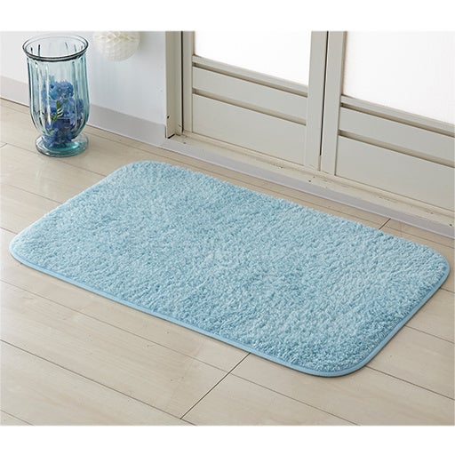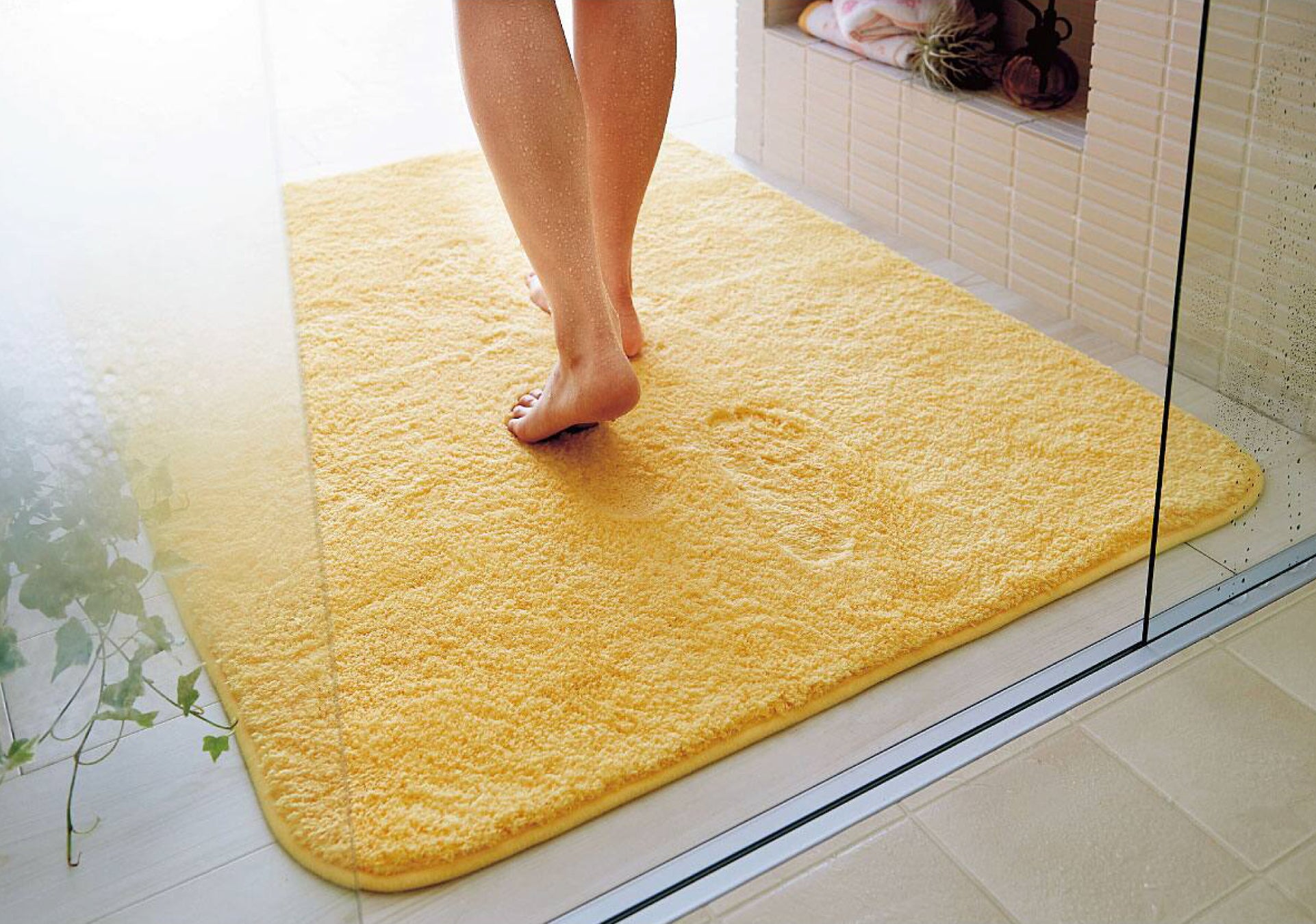 吸い込んだ水分をすばやく拡散する、吸水速乾繊維「コスモトロン®」を使用したバスマット。お洗濯をしても乾きが速く、遊び毛や毛玉が出にくいのが特長。ボリューム感もあり、素足にふんわり心地いい足ざわりです。