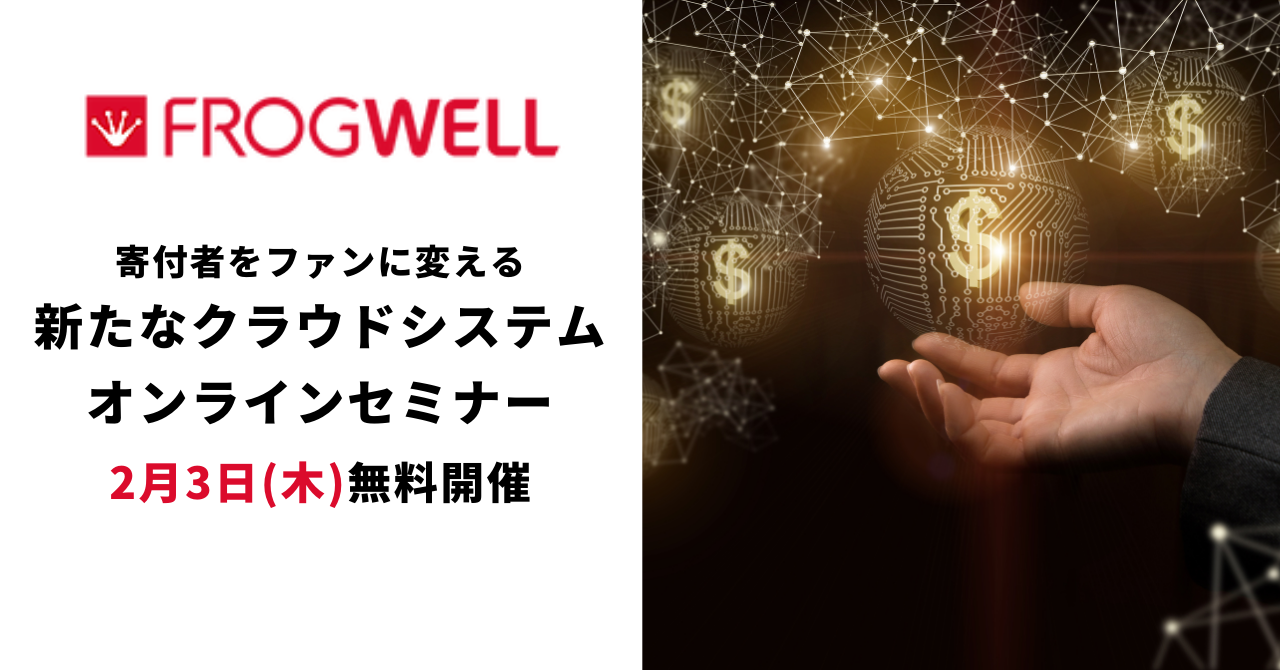 データ・プロセスのコンサルティング及びアウトソーシングサービスを提供しているフロッグウェル株式会社(所在地 : 東京都港区、 代表 : 大田宏之、以下「フロッグウェル」)は、『寄付金の管理をExcelでしていませんか?寄付者をファンに変える、新たなクラウドシステムのご提案!』をテーマとしたオンラインセミナーを、寄付の管理をしている法人の運営関係者の方へ向けて1月25日(火)と2月3日(木)無料開催いたします。