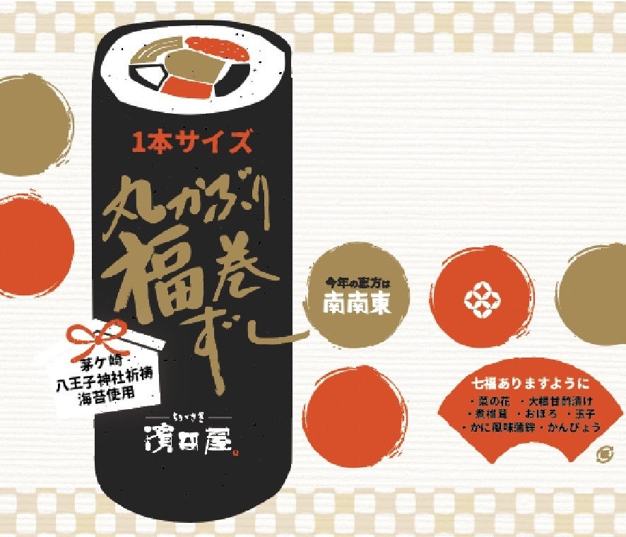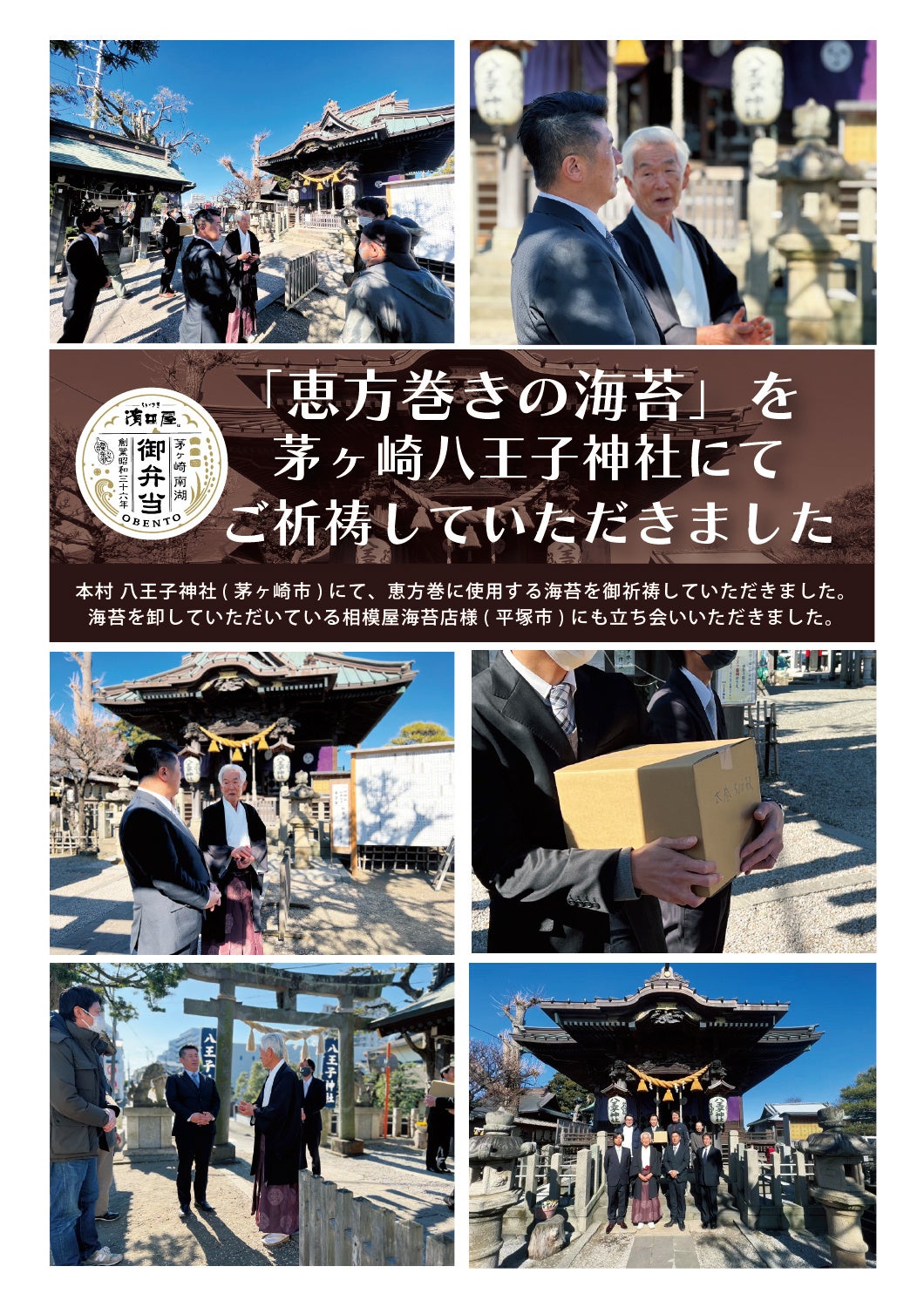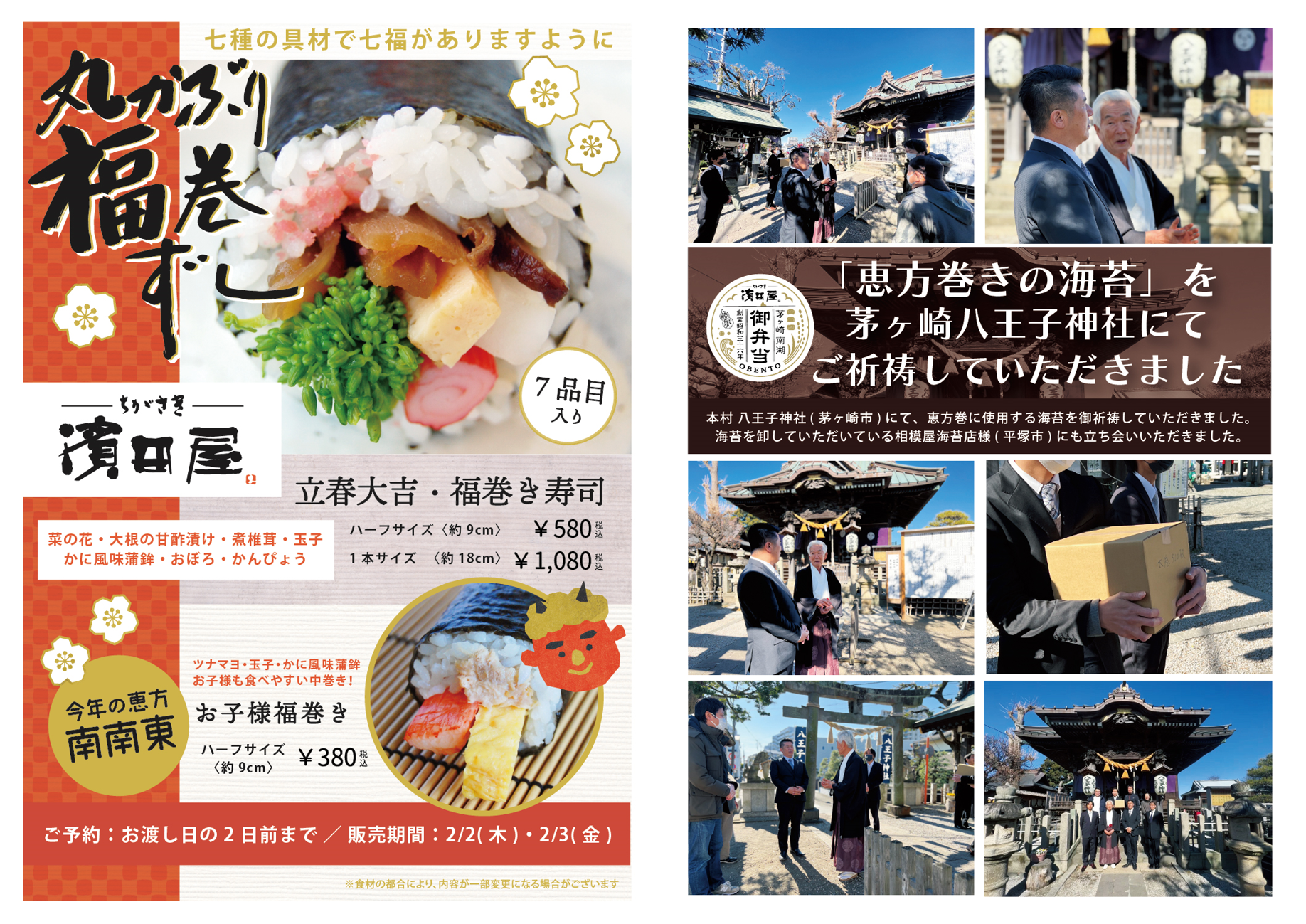 今年は、茅ヶ崎八王子神社(所在地:神奈川県茅ケ崎市本村4-13-40)で祈祷をした海苔で巻き上げた、縁起の良い福巻き寿司が登場です!神奈川県平塚市の「相模屋海苔店」さんの海苔を使用し、具材は1品1品丁寧に仕立てた手づくりの恵方巻をどうぞご家族揃ってお楽しみください。