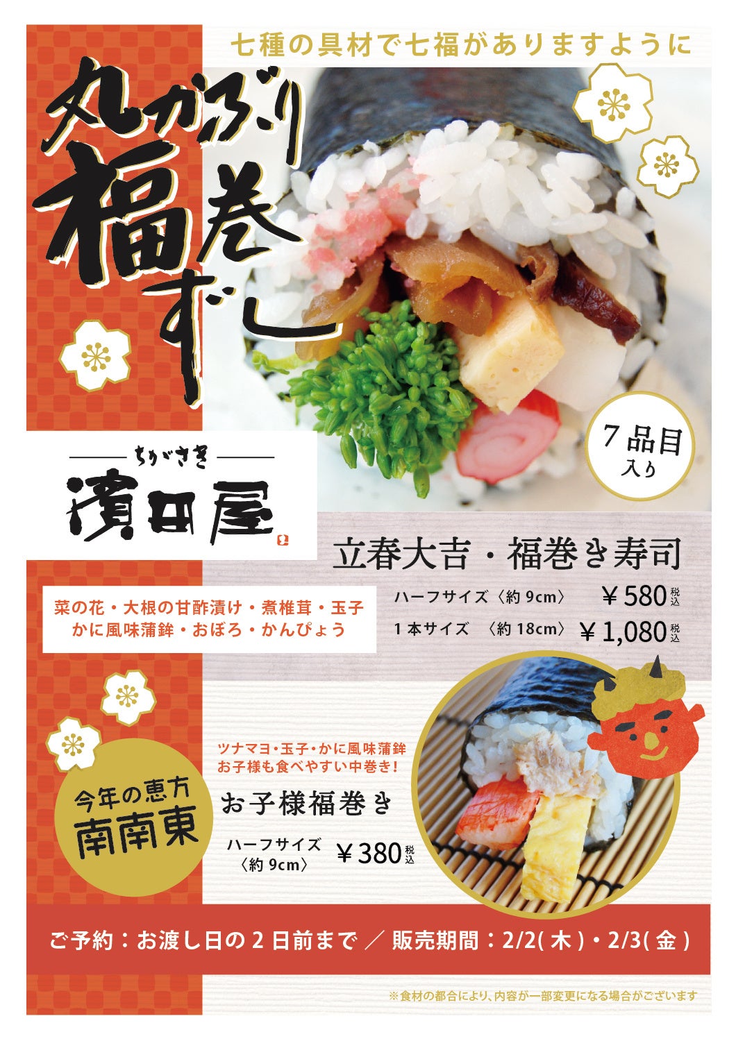 まん福ホールディングスグループのちがさき濱田屋(株式会社浜田屋 本社:神奈川県茅ヶ崎市、代表取締役社長:戸倉大輔、以下 「濱田屋」)では、濱田屋の恵方巻 「立春大吉・福巻き寿司」 「ヒレカツ巻き」 「お子様福巻き」の予約受付を1月25日(水)より開始いたしました。