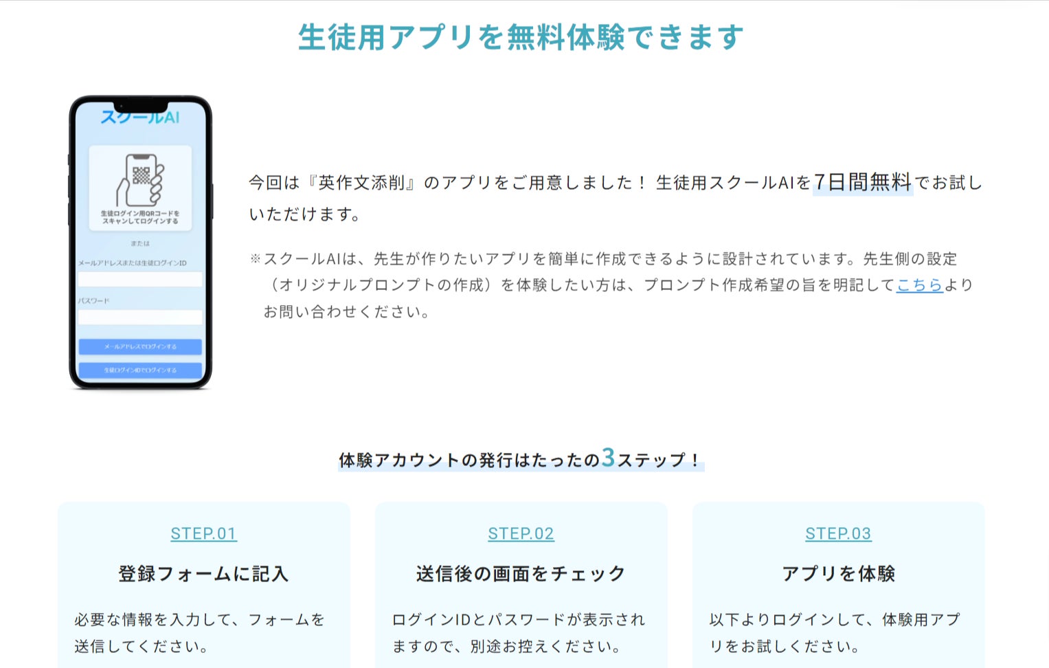 スクールAIは、先生が作りたいアプリを簡単に作成できるように設計されていますが、先生側の設定(オリジナルプロンプトの作成)の体験も別途お受けいたしますので、お問い合わせください。