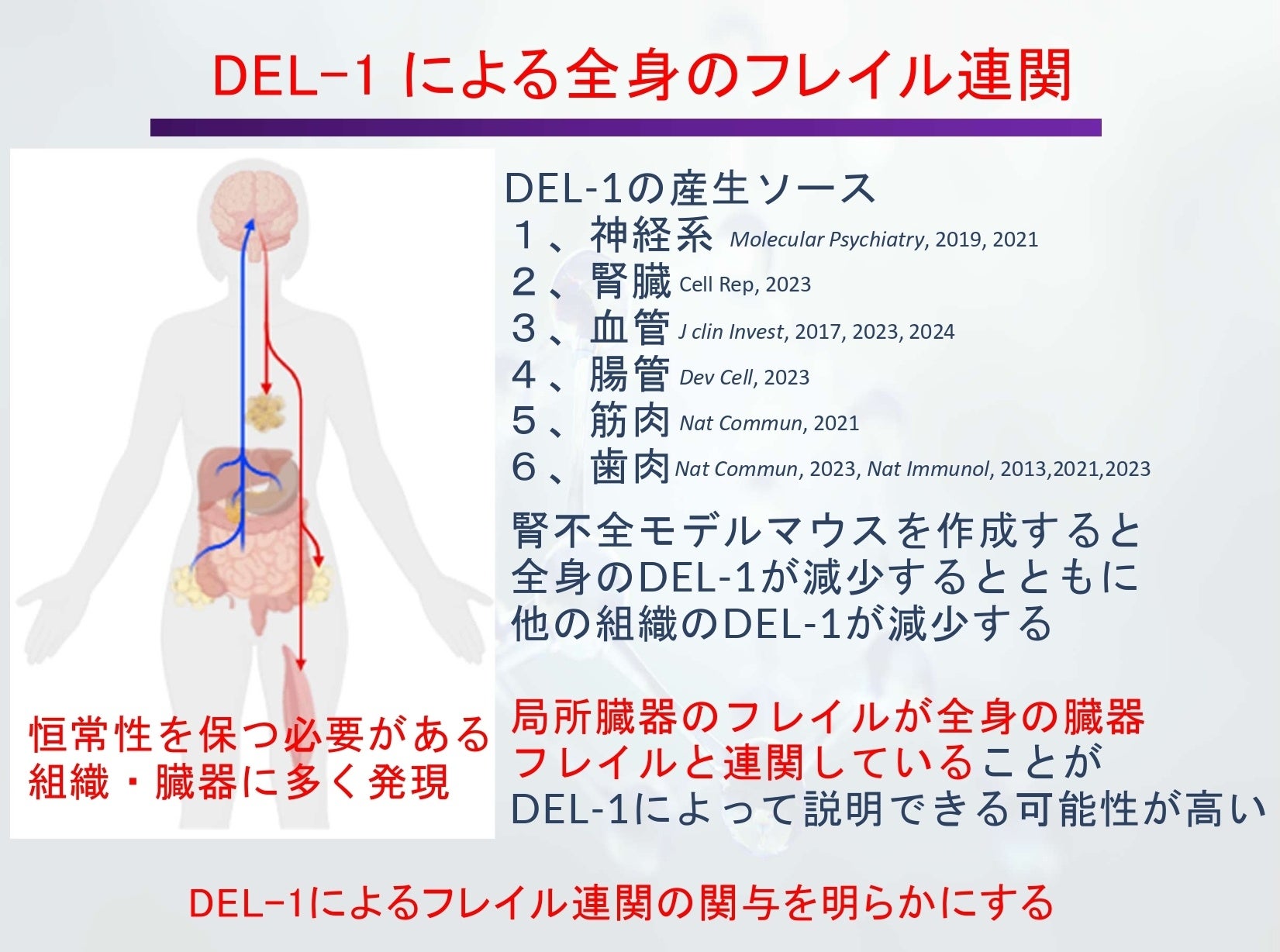DEL-1は、体内の慢性炎症を抑制し、組織の恒常性(ホメオスタシス)を維持する分子であり、加齢とともに減少することが明らかになっています。DEL-1の最も注目すべきメカニズムは、炎症を起こしている老化細胞を減らし、組織全体の慢性炎症を起きにくくすることで、特に神経系や血管、腎臓など再生が難しい臓器に多く発現し、いわば“体の守備力”として機能する点が特徴です。DEL-1の低下は、認知症や腎機能低下、骨粗鬆症などのリスクと関連する可能性が示唆されています。