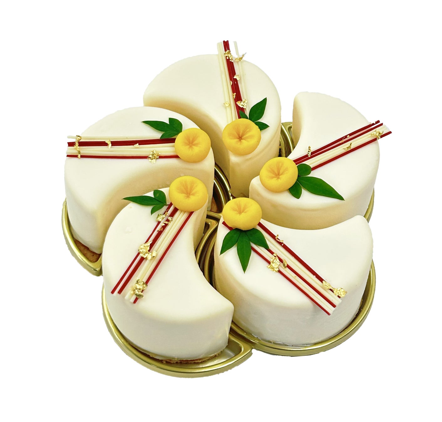 ベルガモットジュレとはちみつのクリームをレアチーズクリームで包み、土台に白ごまと白味噌のサブレを合わせました。柚子の皮を練り込んだ柚子風味の白あんと、水引をイメージした紅白のチョコレートをトッピング。その上から金箔をあしらいました。丸みを帯びた柔らかなカーブで温かさを演出しています。