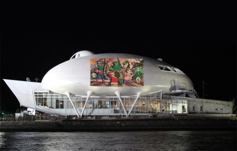 石ノ森萬画館をスクリーンに映画を上映する「かわべでシアター」。夜空の下、ダイナミックに映し出されます。