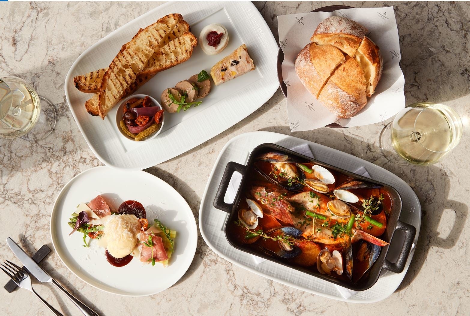 お席についてまず気軽にオーダー頂きたいのが、トスカーナの味を詰め込んだ前菜盛り合わせ4品(鶏のレバーペースト、鶏のテリーヌ、リコッタチーズとイタリア産オリーブと野菜のピクルス)。鶏を頻繁に食するトスカーナ地方の食文化を参考にして作られており、鶏のレバーやテリーヌもひとつひとつ丁寧に手づくりいたしました。イタリアの代表料理ともいえるアクアパッツアは、新鮮なお魚1本丸ごとから採れる魚介のエキスと甲殻類の旨味をぎゅっととじ込めました。運ばれた瞬間に鼻腔をくすぐられる魚介とガーリックの香り、そして口に入れた瞬間に広がる優しいトマトの酸味と魚介の旨味が更にお酒を誘います。