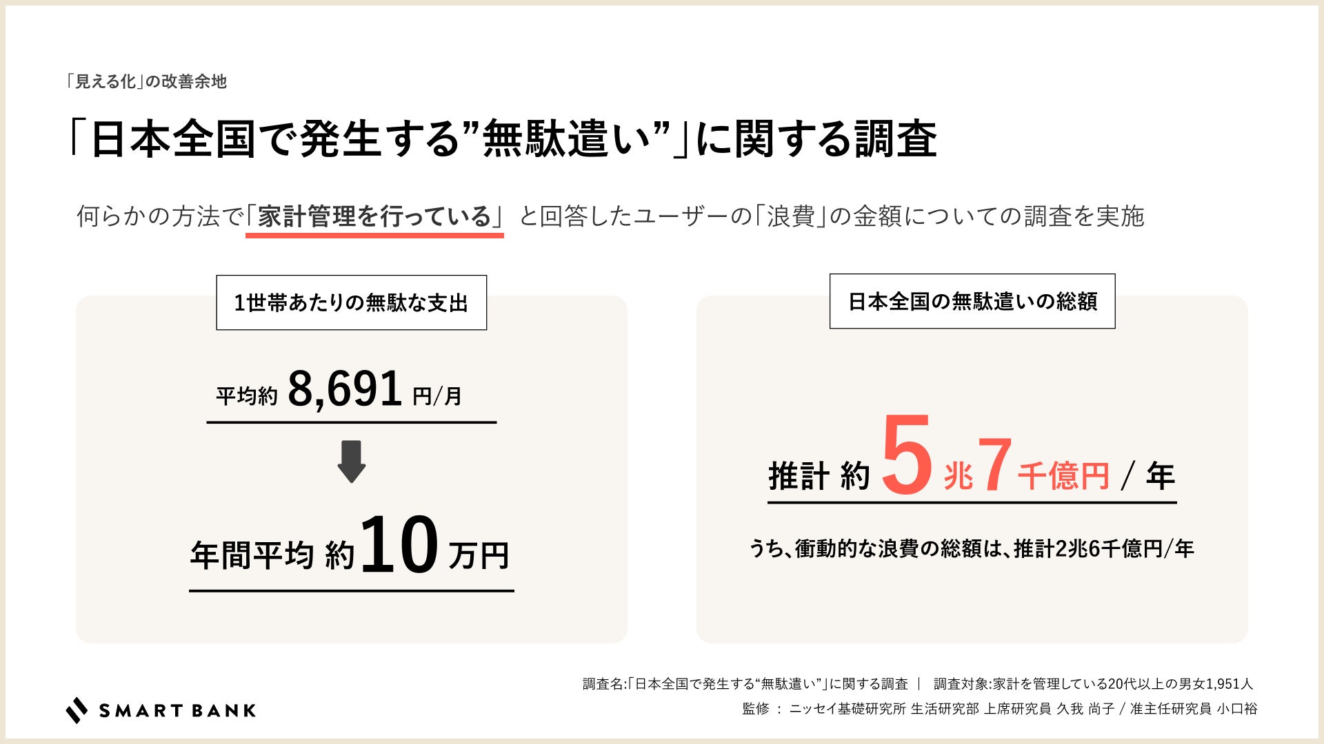 これにより、日本全体で推計約5兆7,927億円にも及ぶ“無駄遣い”を削減し、「資産運用」「旅行」「自己投資」など、本来やりたかったことを実現するための余剰資金の創出に貢献することで、「お金の悩みがなくなる世界」を目指してまいります。