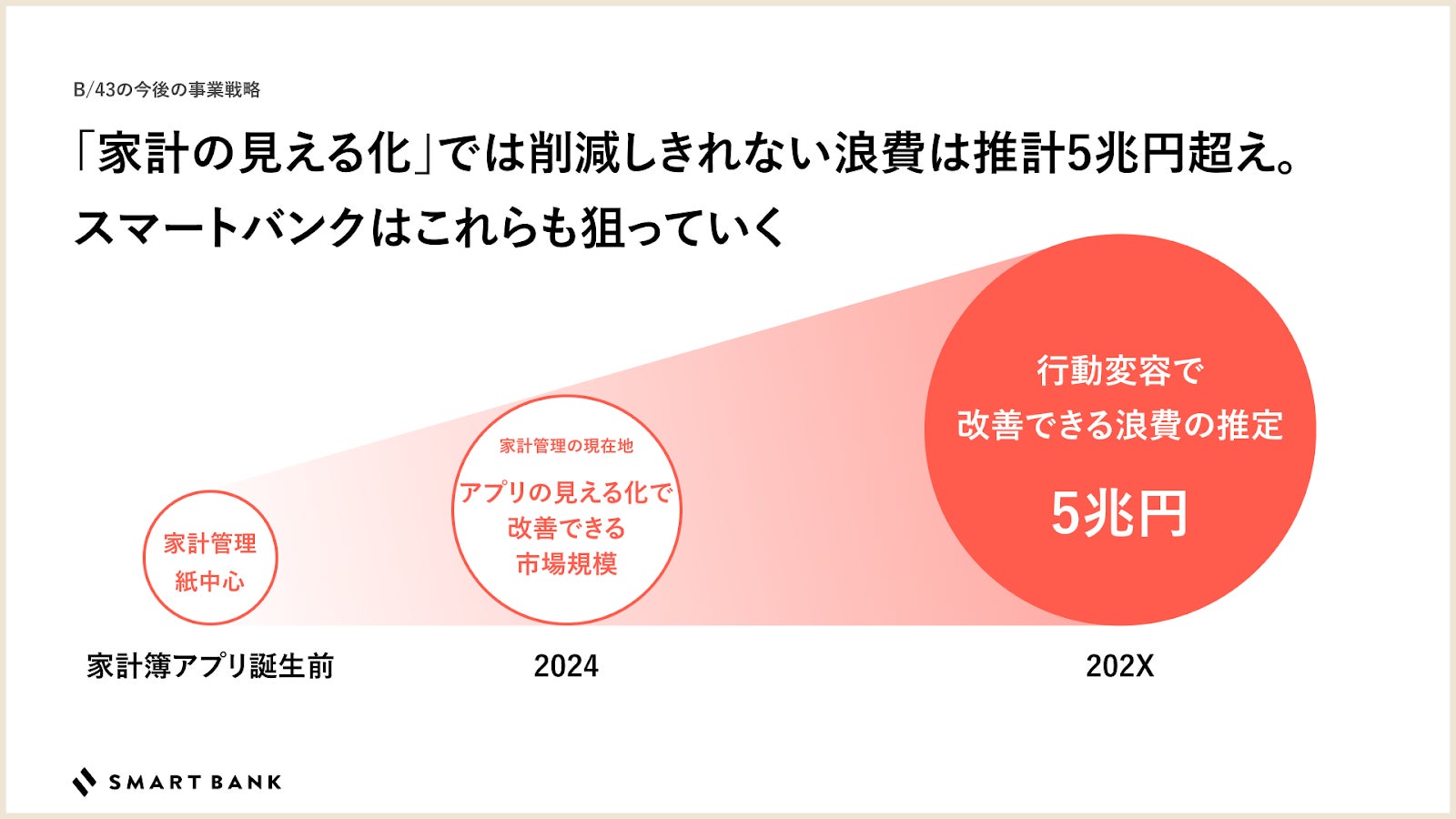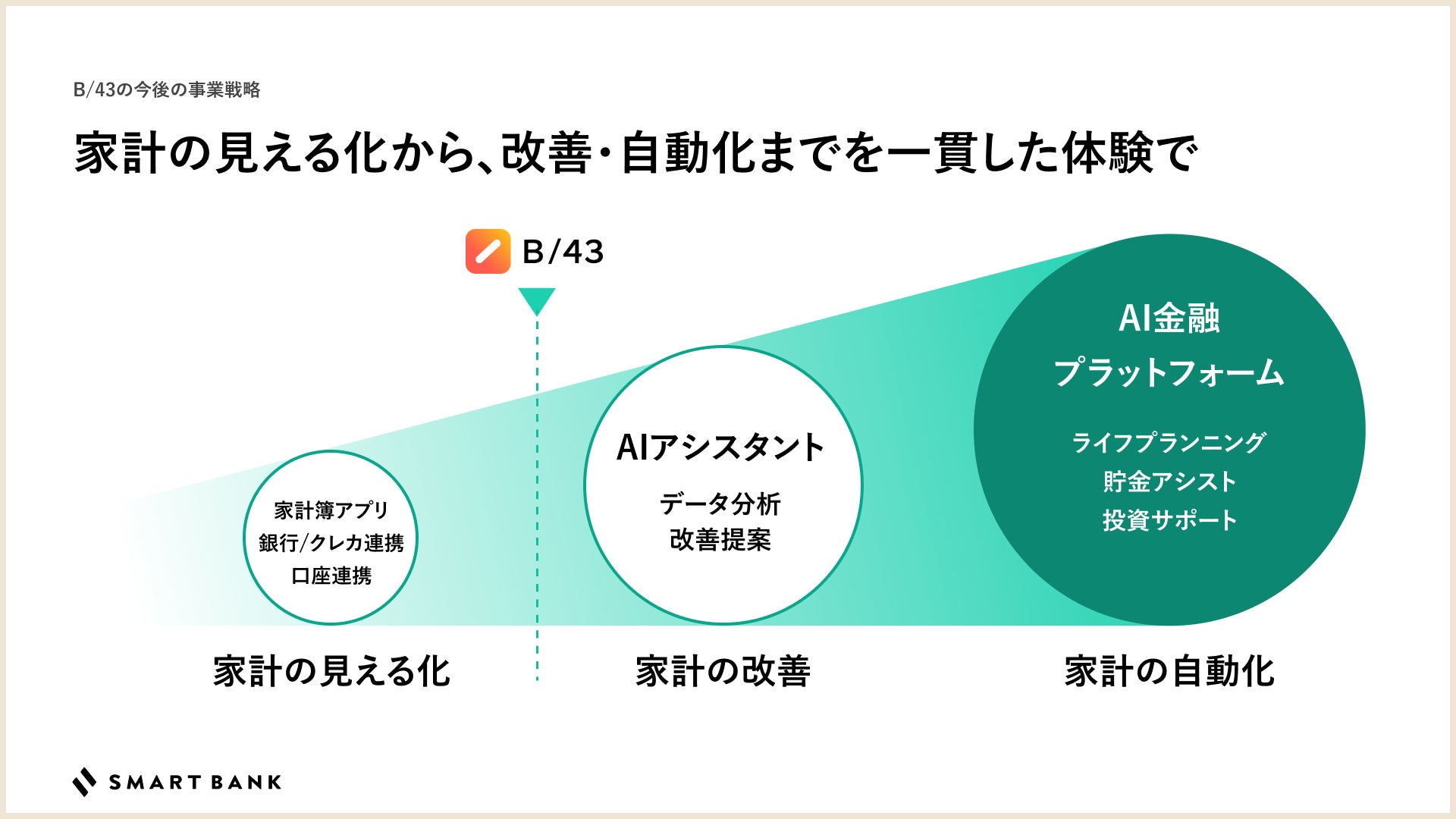 スマートバンクは、キャッシュレス決済の活用により自動的な家計簿作成を可能にする“プリペイドカード”と“家計簿アプリ”がセットになった新しい支出管理サービス「B/43」を開発・提供しています。直近では、クレジットカード・銀行口座連携機能やAIレシート読み取り機能の実装など、プリペイドカード以外の支出も「B/43」アプリ1つで管理をできるようにする機能拡充を進め、家計の見える化・健全化をサポートしています。