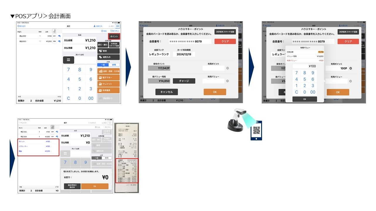 2:会員読み取り画面が表示され会員アプリ等のバーコードを読み取ることでポイントとマネーの残高が表示