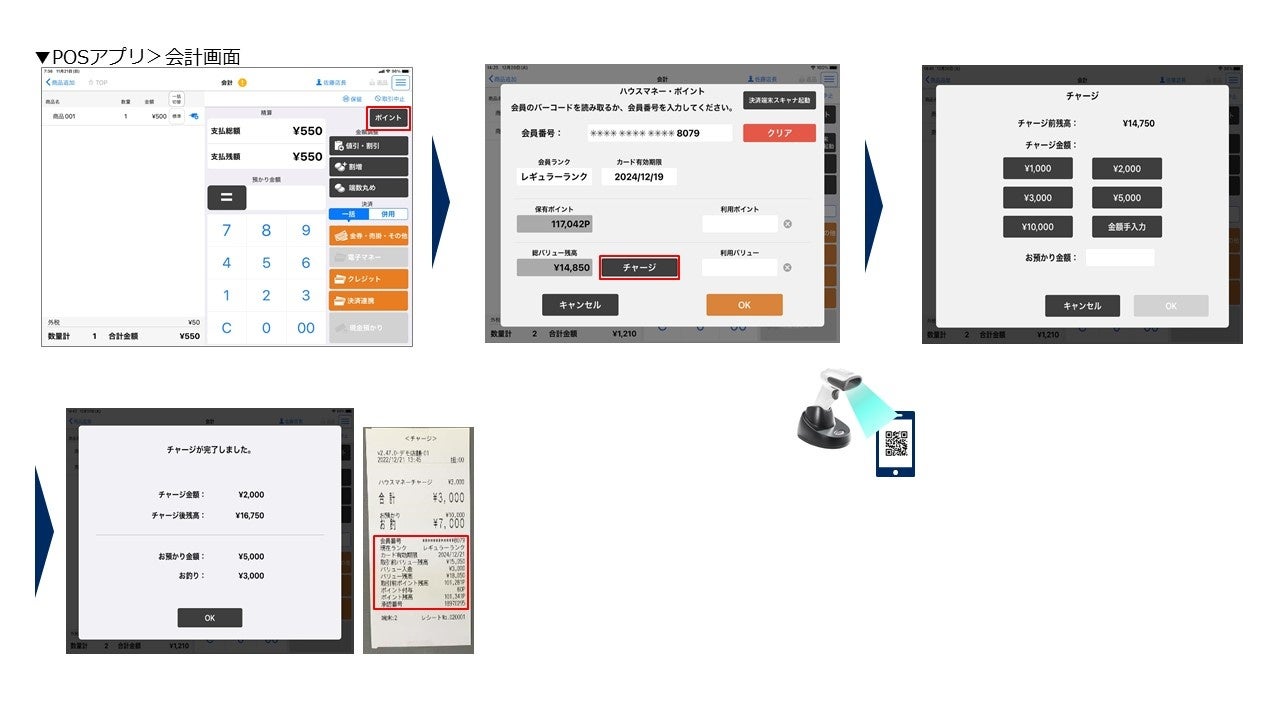 2:会員読み取り画面が表示されるので会員アプリ等のバーコードを読み取ることでポイントとマネーの残高が表示。チャージを行う場合は、チャージボタンを押下