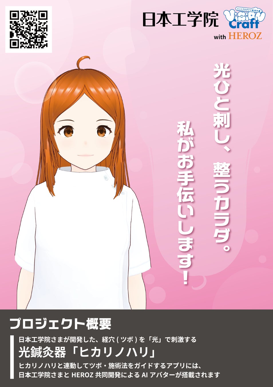 本プロジェクトにおいて、HEROZは、日本工学院が開発中の経穴(ツボ)を光で刺激する光鍼灸器「ヒカリノハリ」のガイドアプリに搭載予定のAIアバターを提供しています。このプロダクトは、10月に開催された「CEATEC 2024」や11月に開催された「AI・人工知能EXPO」でも展示されました。このほかにも、現在、AIクレーン機の共同開発に着手しています。