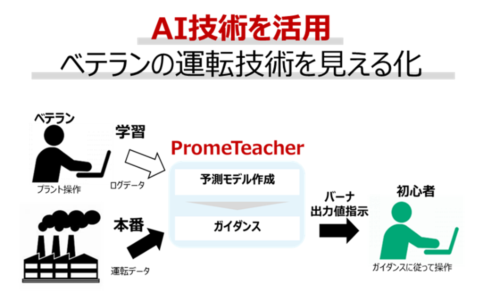 本製品は、ベテランオペレーターによる運転ログデータをAIが学習することで、ベテランオペレーターの勘所を可視化します。そのデータを基に、生成されたガイダンスに従うことで、初心者でもベテランと同等の操作を実現することが可能となります。