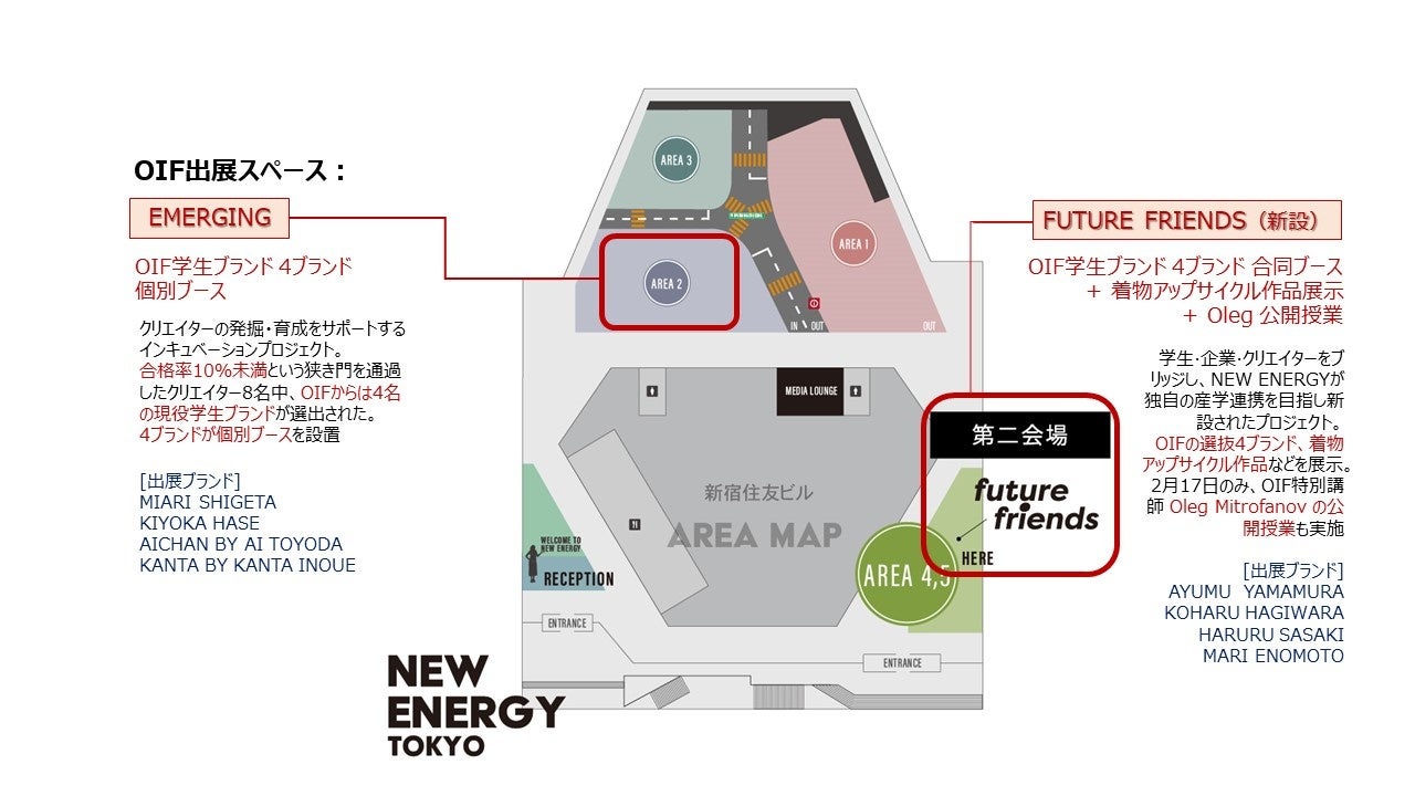 デザイナーおよびファッション⼈材を育成する⼤阪⽂化服装学院(以降OIF、学校法人ミクニ学園 理事長:豊田晃敏 所在地:大阪市淀川区三国本町)の最高峰学科であるスーパーデザイナー学科は、2月15日~18日に新宿住友ビル三角広場で開催されるクリエイションの祭典「NEW ENERGY TOKYO」にて、従来の学生ブランドの合同展示ブースに加えて、合格率10%未満の狭き門であるインキュベーション企画「EMERGING」に4名の学生が選出され、各学生ブランドの個別ブースを設置することとなりました。
