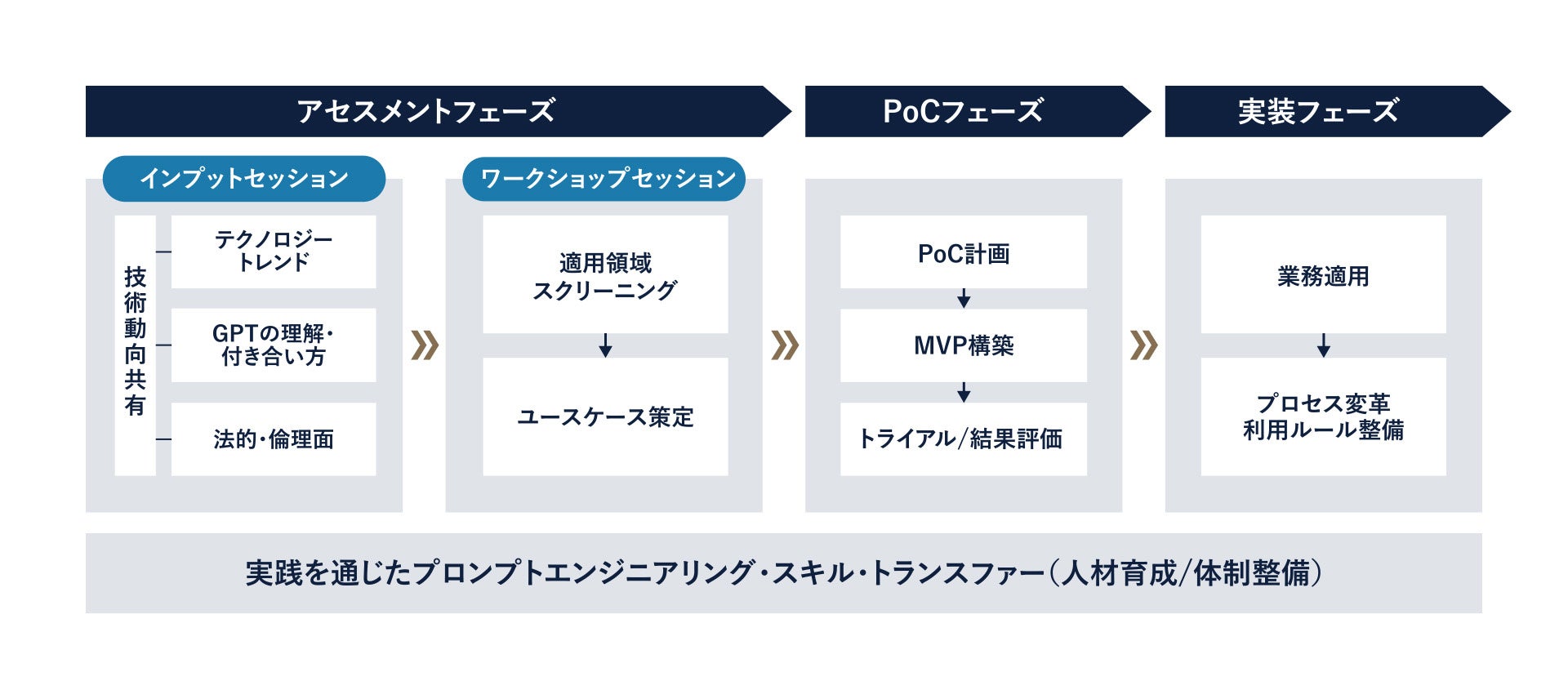 生成系AIコンサルティングサービスは企業や組織が生成系AI技術を効率的に活用し、企業の競争力向上やイノベーション推進を支援するサービスです。サービスは、アセスメント、実証実験(PoC)、実装の3つのフェーズから構成されています。