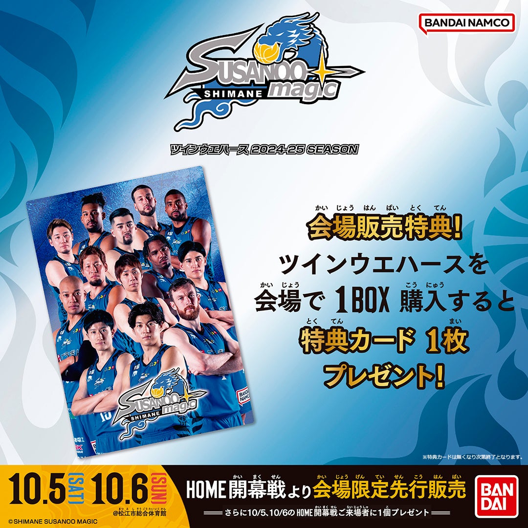 松江市総合体育館でのシーズン開幕戦では、一般販売に先駆けて「島根スサノオマジック ツインウエハース 2024-25 SEASON」をご購入いただけます。