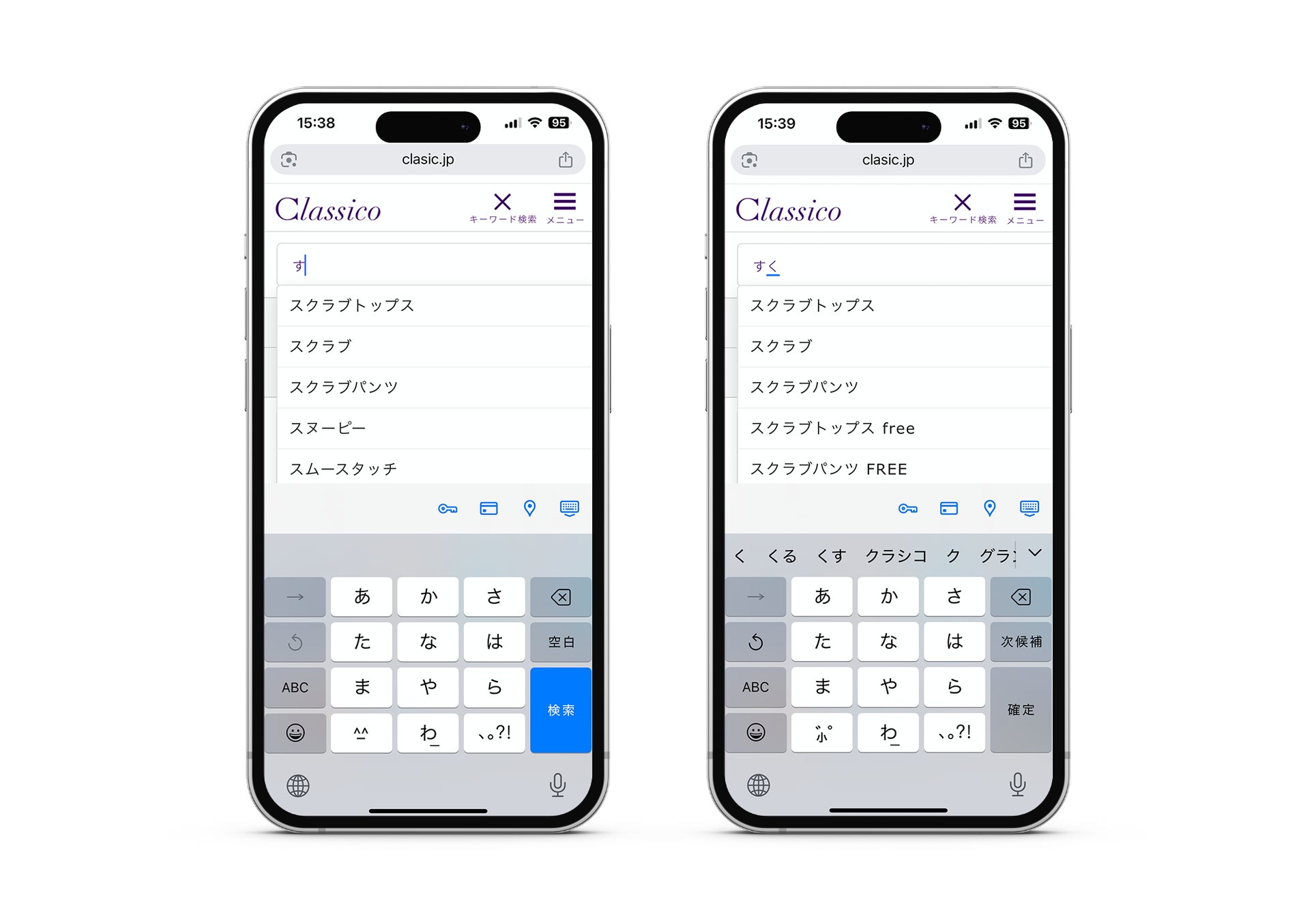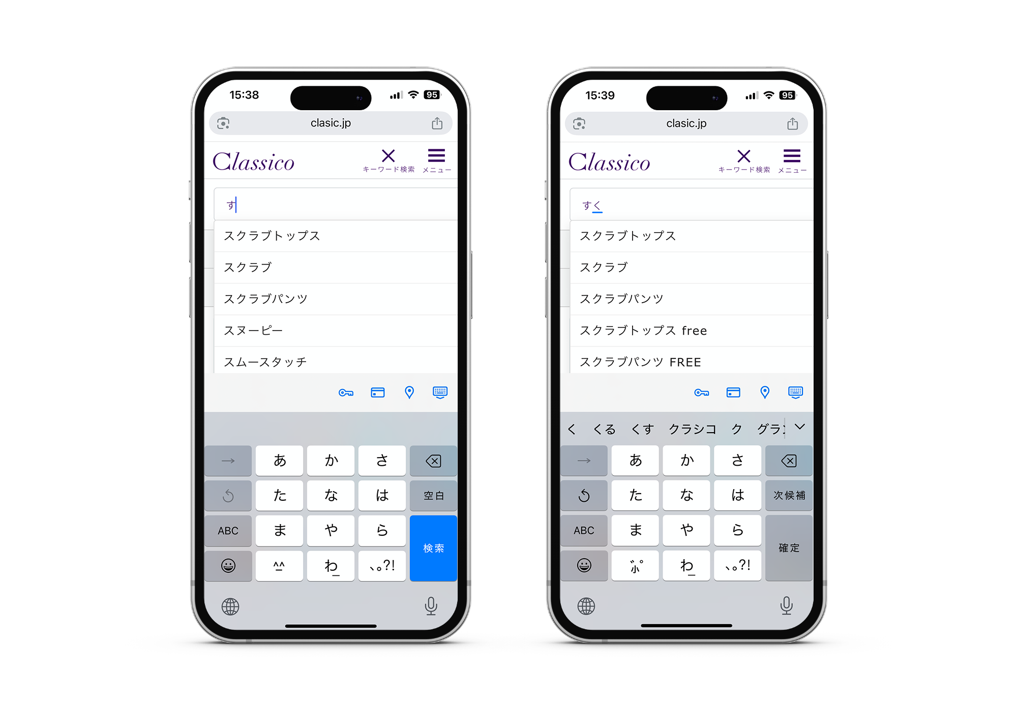 「ユニサーチ」のキーワードサジェストは、お客様が検索窓に文字を入力するたびに、一文字ごとに最適なキーワード候補をリアルタイムで予測・表示します。 「スクラブ」「白衣」といった基本キーワードだけでなく、人気のシリーズ名や特定の機能性キーワードも先回りして提示。忙しい医療従事者の入力の手間を大幅に削減し、ストレスのないスムーズな商品検索をサポートします。