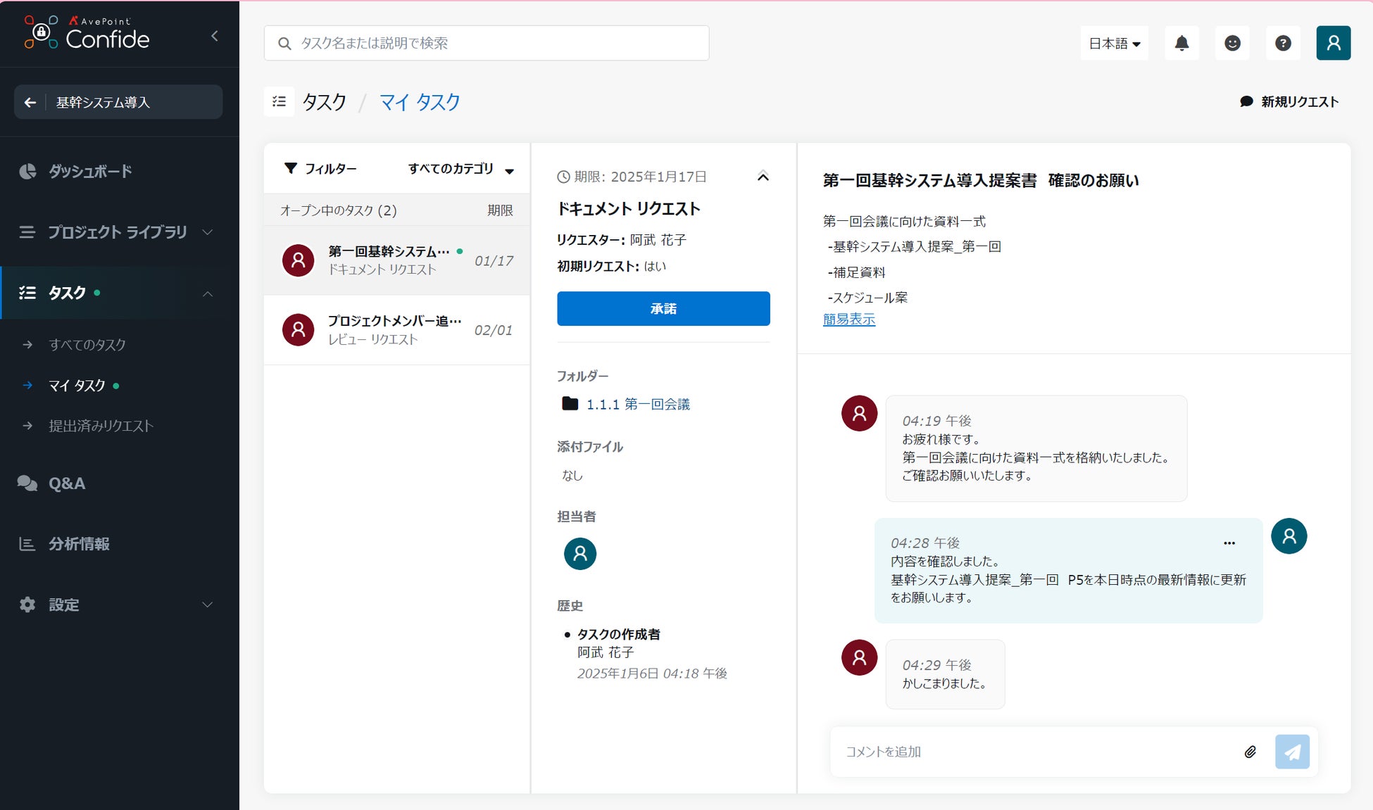 「AvePoint Confide」は、Microsoft 365 環境内で利用可能なバーチャルデータルーム(VDR)ソリューションです。高度なセキュリティ管理機能により、データのアクセス権を厳密に制御でき、情報漏洩リスクを低減します。AvePoint独自のガバナンスフレームワークを活用して構築されたこのソリューションは、TeamsやSharePointなど使い慣れたツールとシームレスに連携し、M&Aや法務、財務など機密性の高いプロジェクトにおいて、効率的かつ安全なデータ共有を実現します。また、メールに依存したやり取りを削減することで、業務工数を大幅に削減し、プロジェクトの進行スピードを向上させ、事業の効率化と競争力の強化に貢献します。さらに、日本語対応のサポートも備え、国内企業にとって安心して導入できる点も大きな特徴です。Confideは、プロジェクト管理やM&A(企業買収・合併)など、情報の機密性が求められる場面で特に有効です。これにより、安全性と効率性の両立を実現し、企業の業務を次のレベルへと引き上げます。