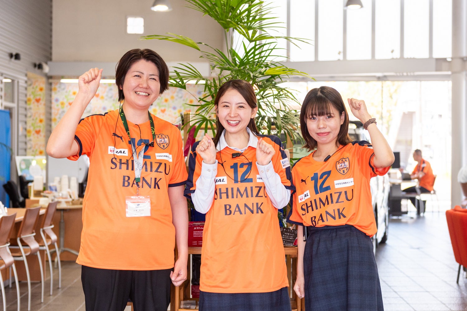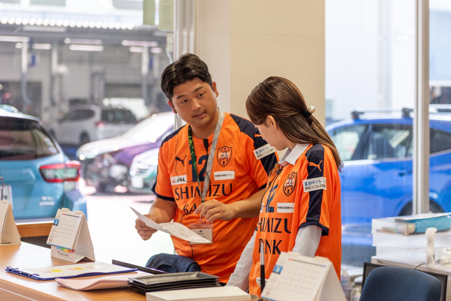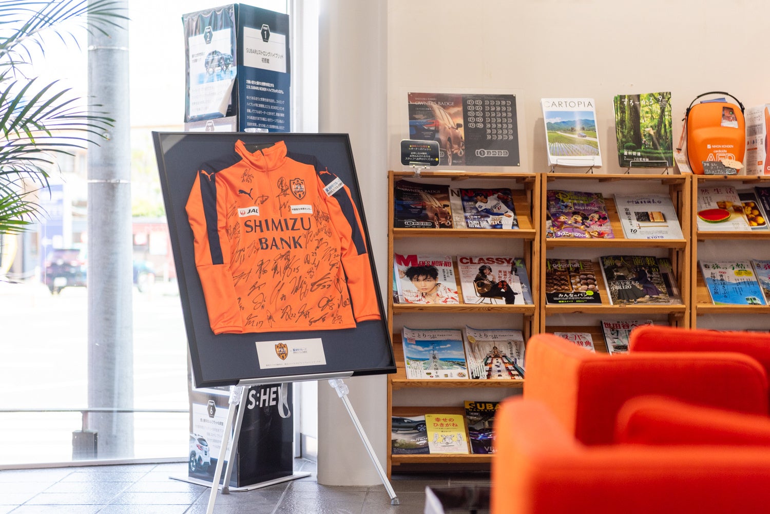 静岡スバル清水店ならびに静岡店にて、ショールームに選手のサイン入りユニフォームを展示し、お客さまにもご覧いただきました。また清水エスパルスホームゲームの日にはスタッフがトレーニングウェアを着用して接客し、応援の気持ちを表しました。鮮やかなオレンジ色のウェアは人目を惹き、お客さまからも大変好評でした。この様子は清水エスパルスの公式Xでも紹介され、清水エスパルスファンの方々からも温かいメッセージが寄せられています。今期も引き続きトレーニングウェアを着用し、お客さまと一緒に清水エスパルスを盛り上げます。