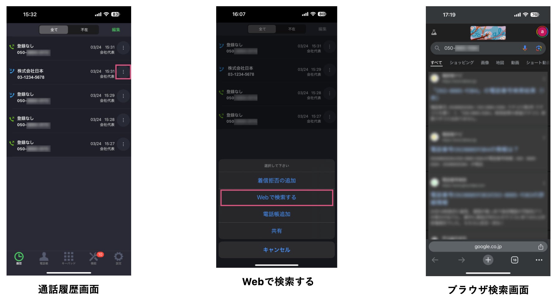 株式会社グラントン(本社:東京都渋谷区、代表取締役:井本賀津雄、以下「グラントン」)は、クラウドPBXサービス「03plus」において、2025年3月26日より迷惑電話対策機能の一環として、通話履歴画面に「Web検索」メニューを追加しました。この機能により、着信履歴に残った不審な番号を簡単に検索できるようになり、迷惑電話や営業電話、詐欺電話に出るリスクを軽減できます。