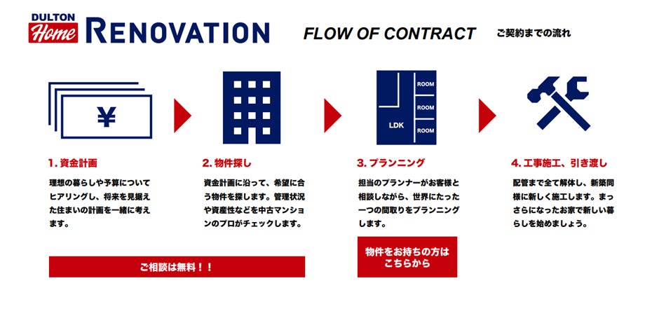 ダルトンが内装デザインから家具雑貨コーディネートに至るまで監修したリノベーションプランをご購入頂けます。物件をお持ちでない方には、リノベーション向き中古マンション探しからサポートします。既に所有されているご自宅をリノベーションすることも可能です。ご家族ごとの暮らしや予算をヒアリングしながら、間取りをプランニングするオーダーリノベーションです。
