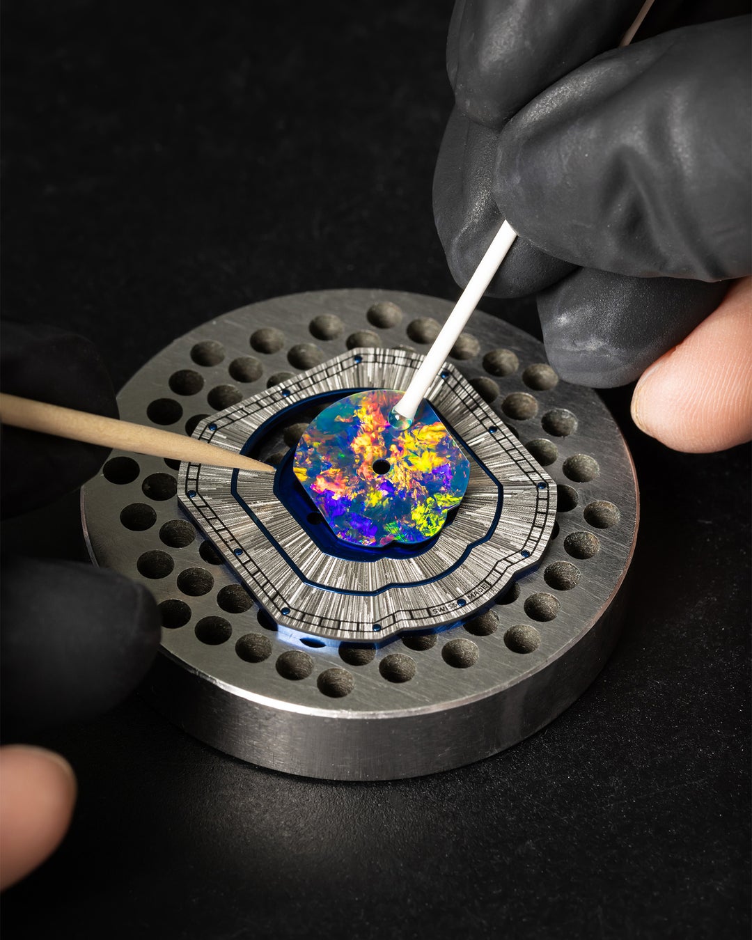 •マザー・オブ・パール・ダイアルから、オーストラリア産ファイアー・オパールをコアに、メタギョーシェ仕上げで囲まれた、より洗練されたバージョンへ