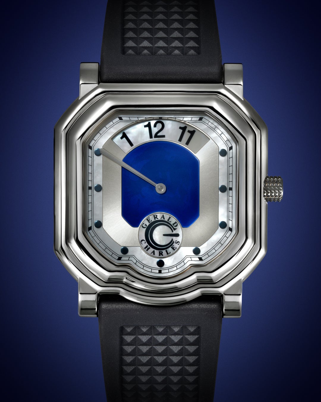 ケースバックには購入者のイニシャルがエングレーヴィングされ、この唯一無二の時計がさらにパーソナライズされたものとなります。そしてこの時計にはオレンジとブルーの2色のストラップと、ポリッシュ仕上げのチタン製バタフライ式バックルが付属します。レザー、ベルクロ、ラバーのアディショナルストラップの選択肢もあります。コレクターにとっては、ジェラルド・チャールズの特別な作品を手に入れるまたとない機会となることでしょう。