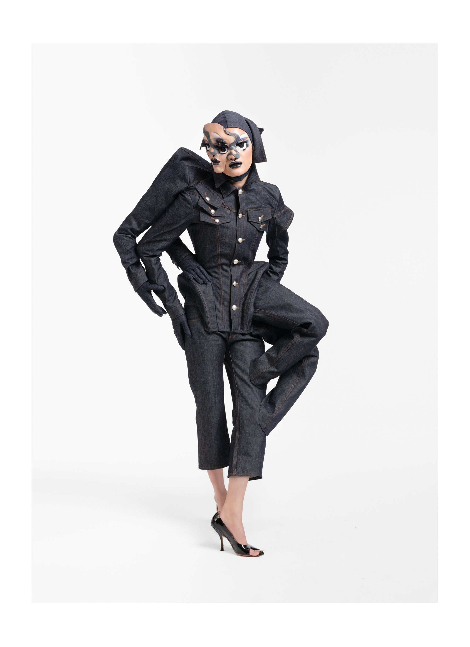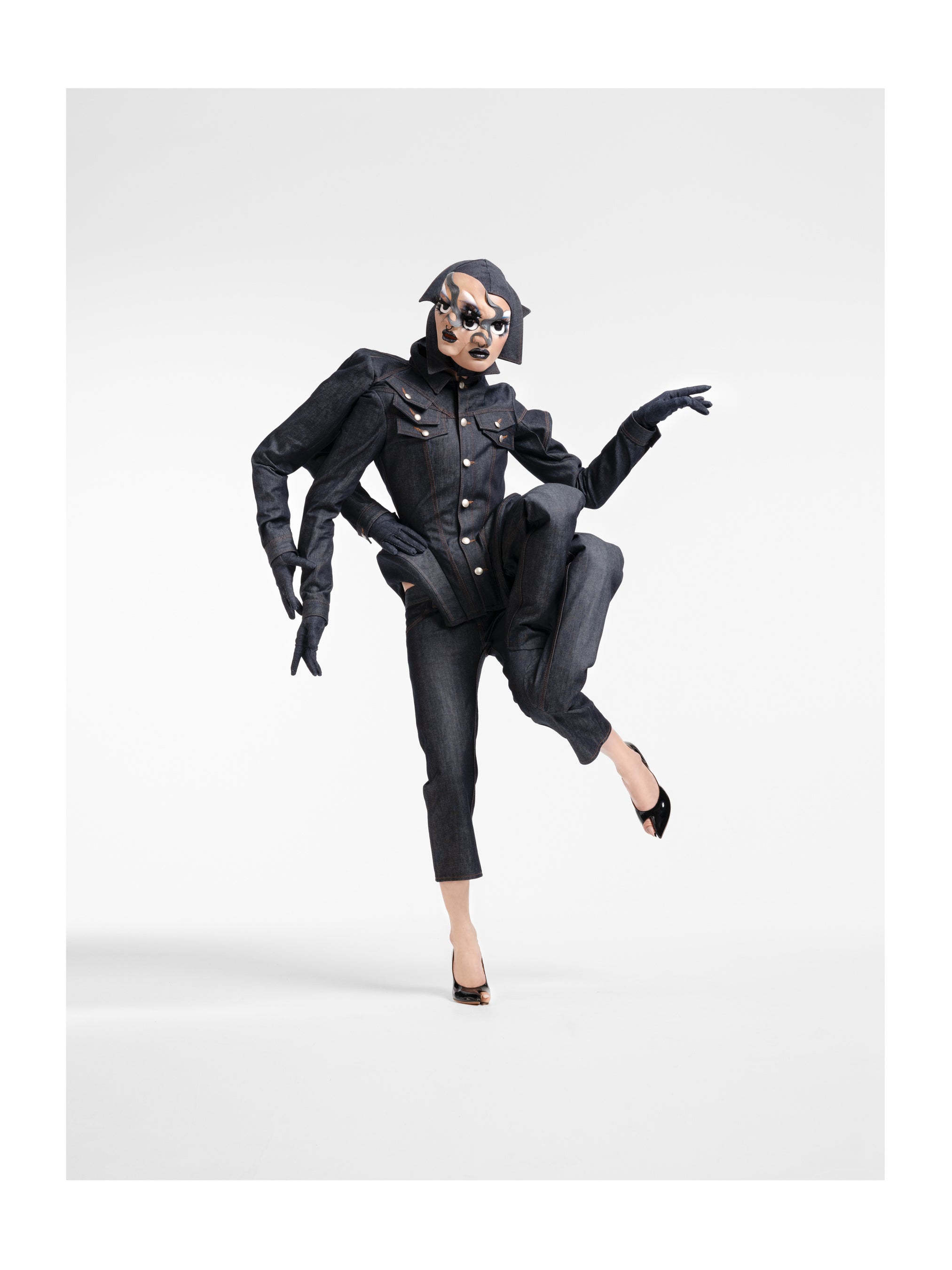 ハングリーのためのルックは、デニムを着た人々でごった返す大都市への憧れをイメージしてデザインされています。この「アナトミカル・ディストーション(Anatomical Distortion)※写真左」 は、「解剖学的な歪み」を意味するネーミングが示す通り、複数の身体をひとつに融合させるような感覚を、遊び心を持って表現しています。クラシックなデニムジャケットとカプリジーンズの基本的要素を土台に、カジュアルなルックから芸術的なクチュールピースを生み出しました。