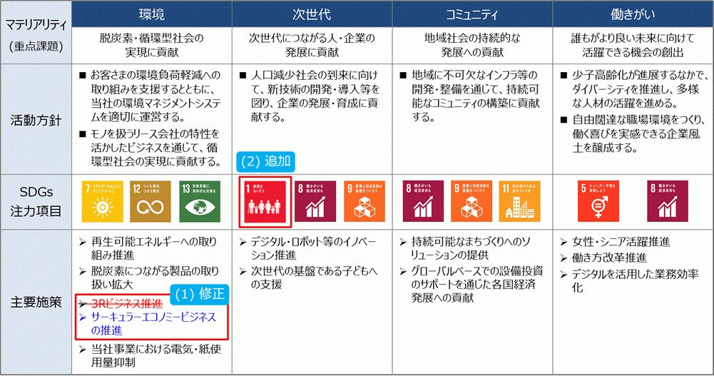 SMFLは、「環境」「次世代」「コミュニティ」「働きがい」の4つのマテリアリティを選定し、SDGsの17の目標のうち7つを注力項目に掲げ、事業活動に取り組んでまいりましたが、今般、今後の取組方針を反映し、マテリアリティを一部見直しました。2023-2025年度の中期経営計画で主要施策として掲げている「サーキュラーエコノミーを実現していく第一人者としての活動」や「事業を離れた社会の優先課題に対する貢献」と整合するものとなります。