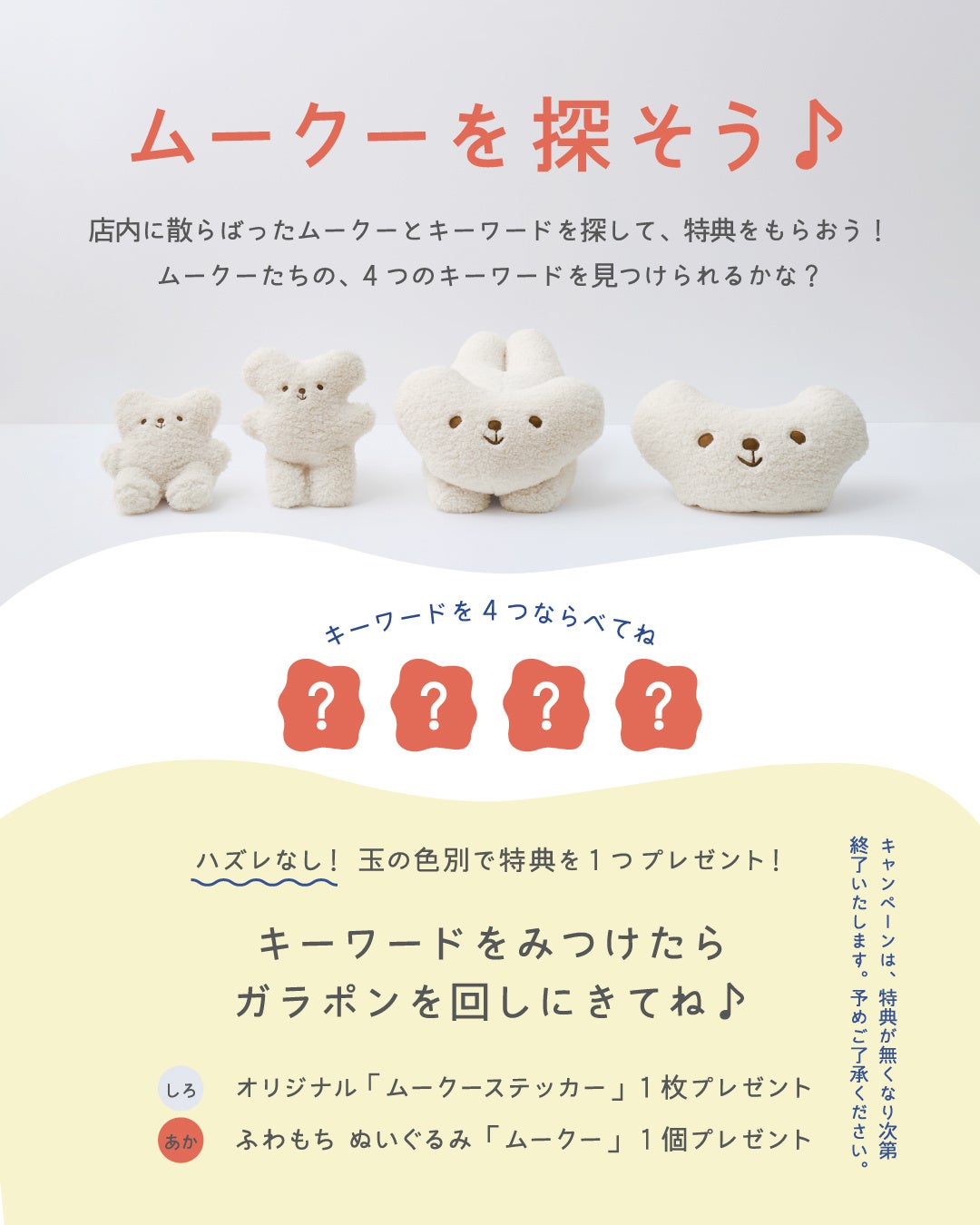 店内には、くまのぬいぐるみ「ムークー」が4種類隠れています。ムークーが持っているキーワードを4つ合わせると、ハズレなしのガラポン抽選に参加できます!