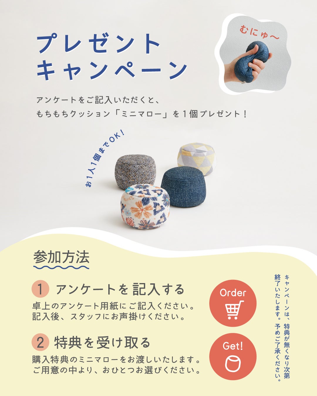 店頭で簡単なアンケートにご回答いただいた方には、もちもちクッション「ミニマロー」をプレゼントいたします。