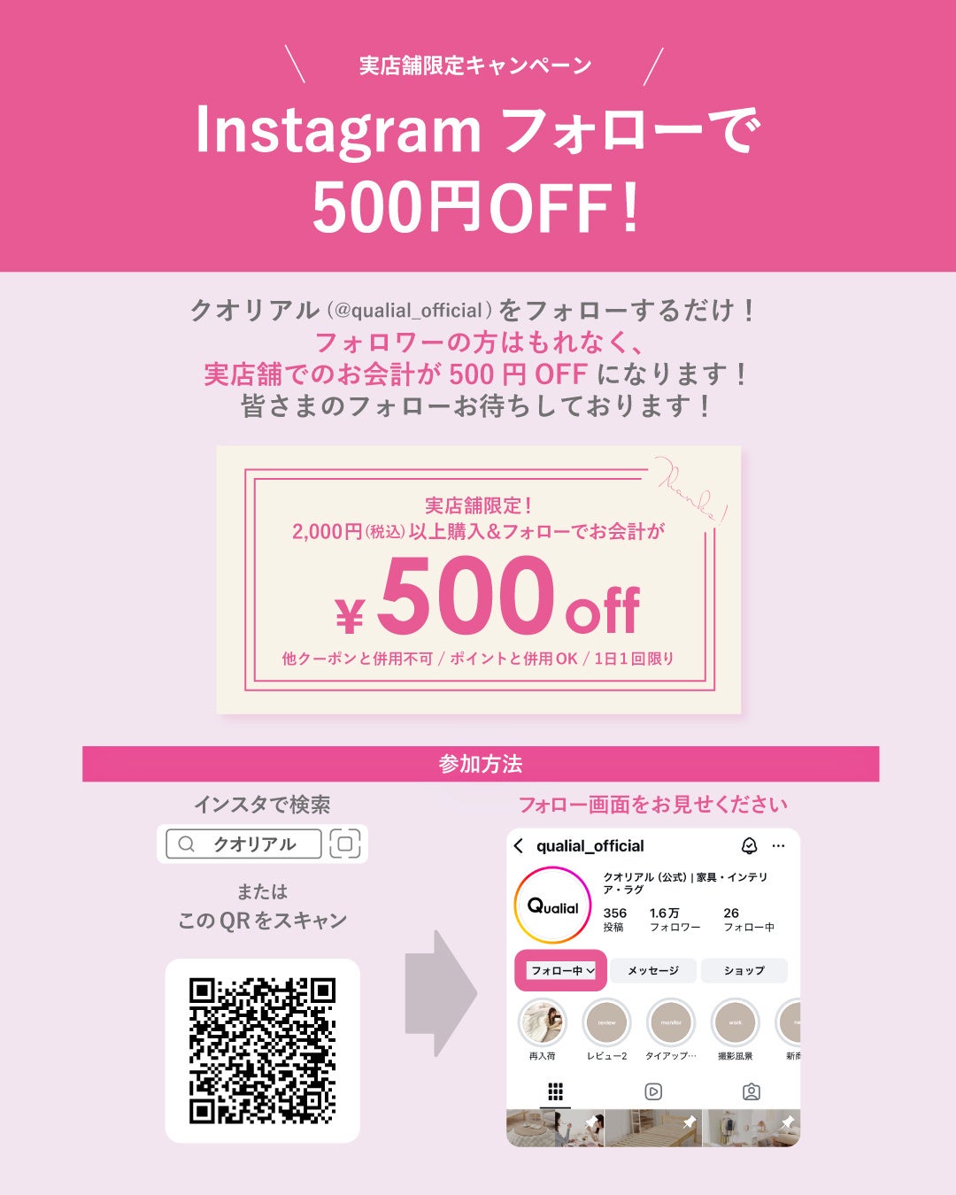 クオリアル公式Instagramをフォローすると、2,000円以上のお買い物で500円OFF。2回目以降のご来店でも、Instagramフォロー画面のご提示で500円OFFの割引をいたします。