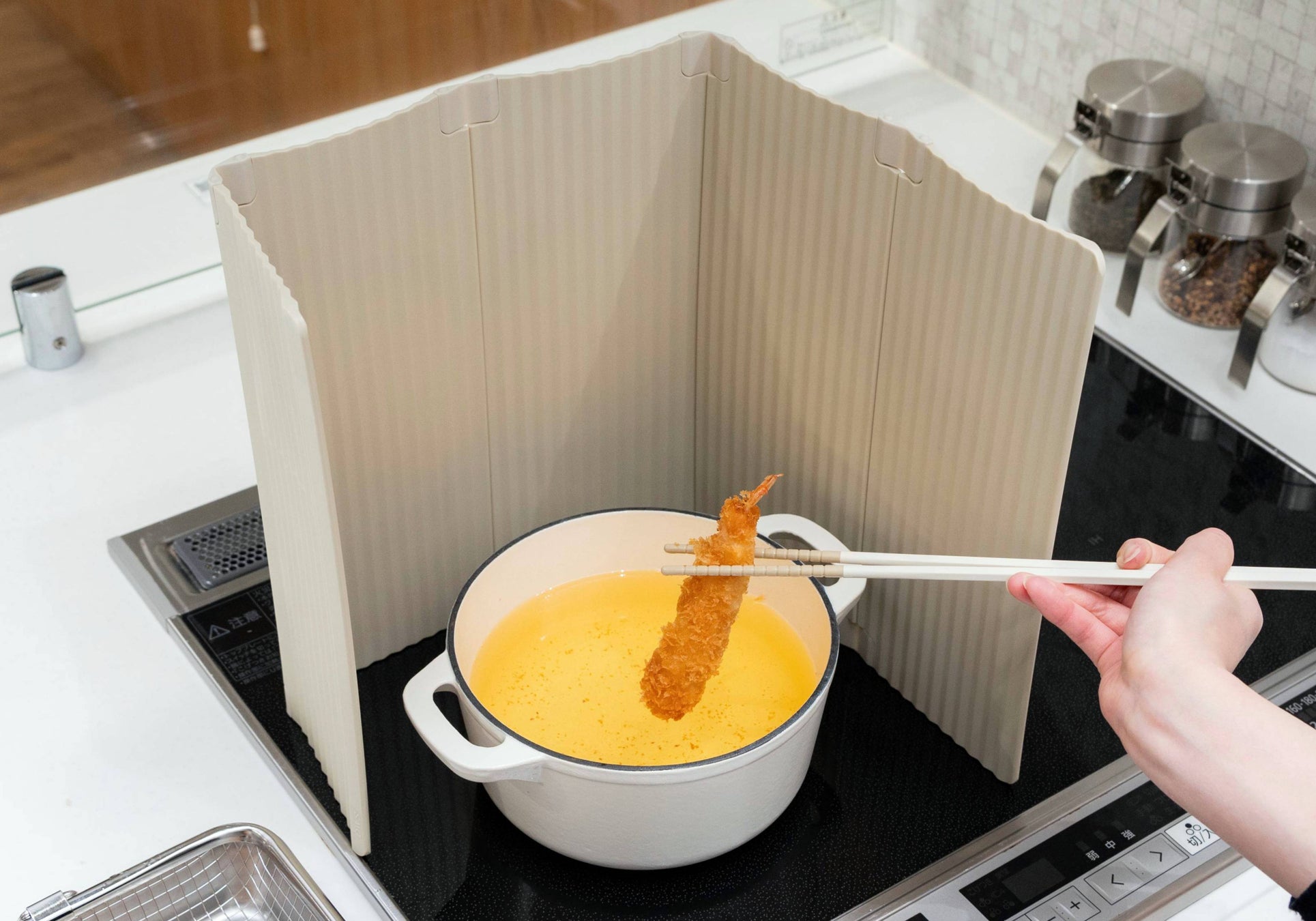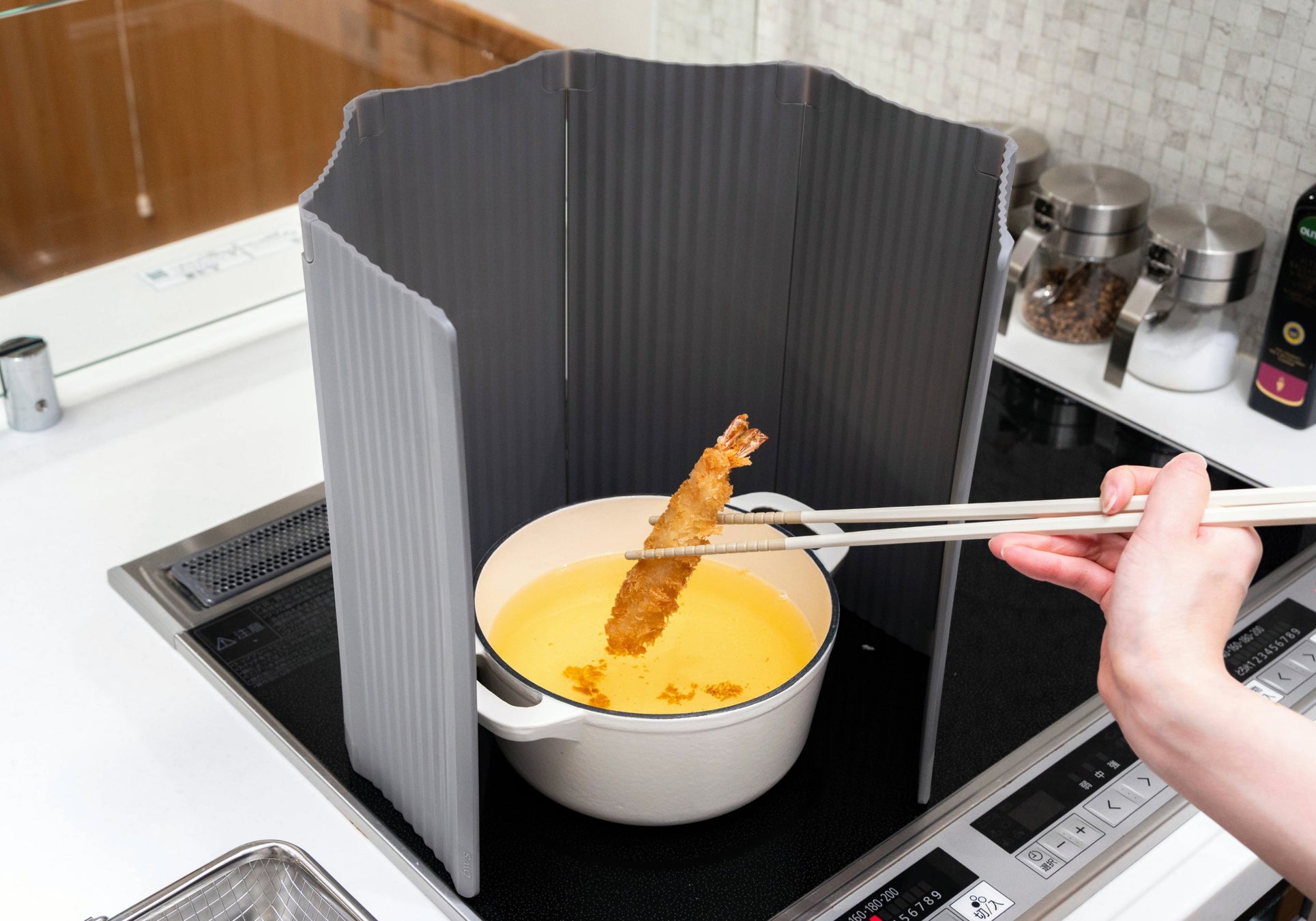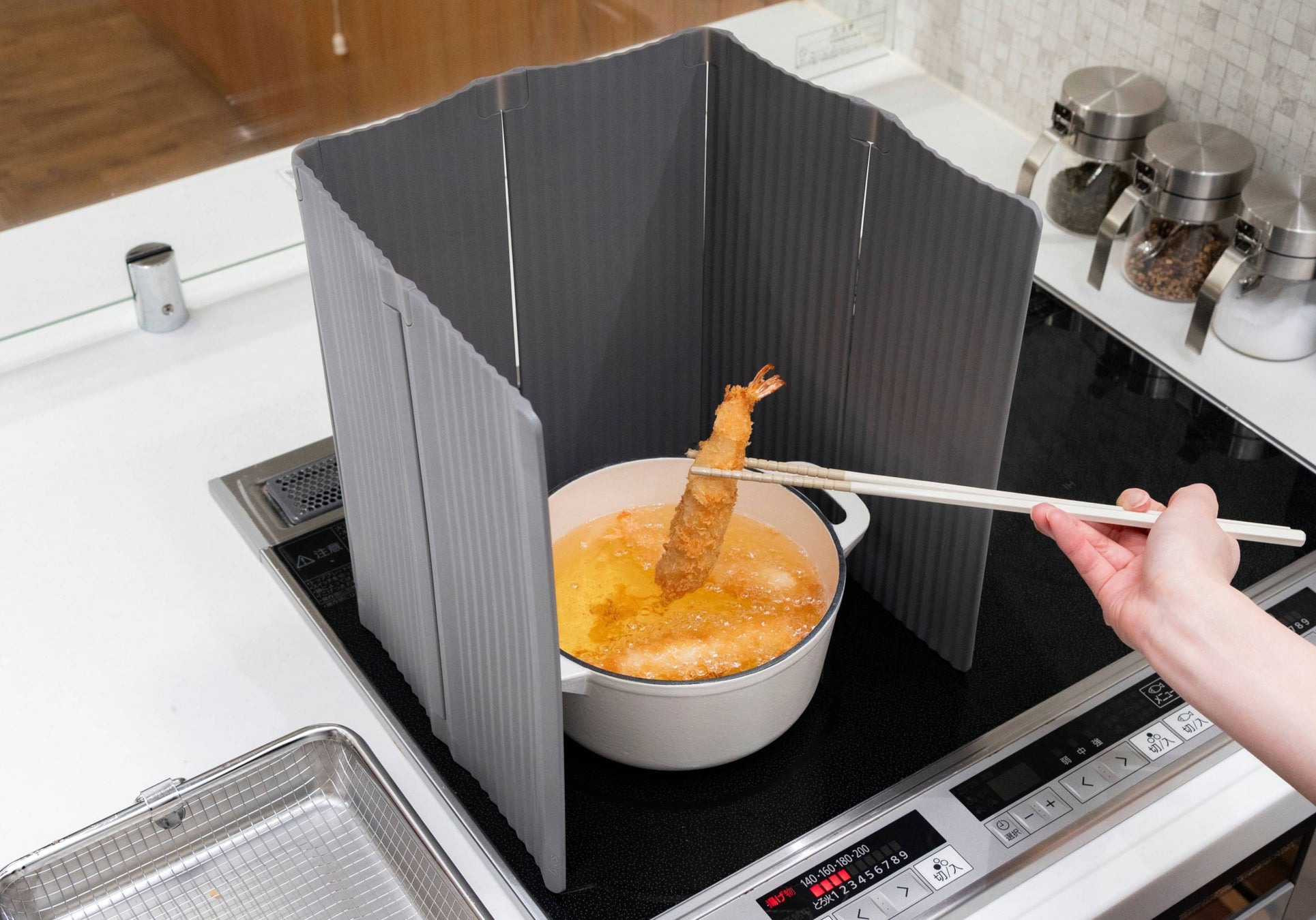 お鍋の形に合わせた自由な囲み方で油跳ねをしっかりガード