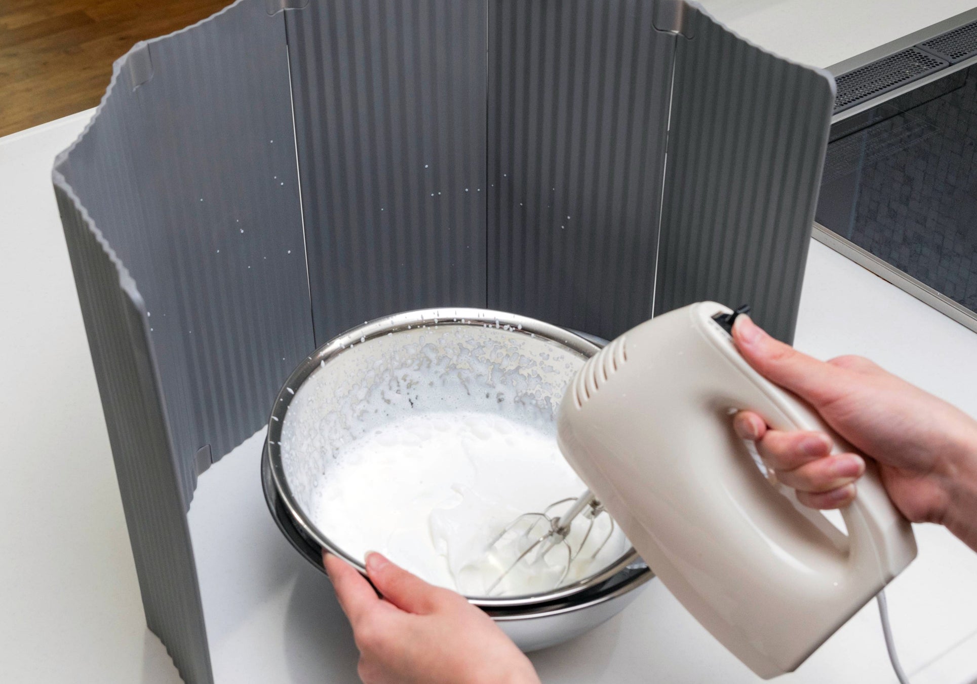 6枚タイプはM字型に囲って立てることができるため、コンロ2口分をカバーし同時調理にも対応可能です。また、自由に形を変えることができるため、サイドパネルを折り返して食材の移動をスムーズに。調理中のストレスを減らしてくれます。