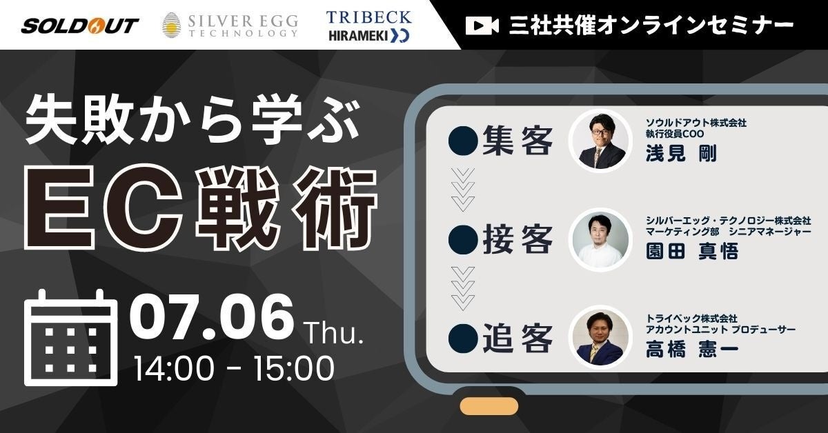 AI技術をベースとしたデジタルマーケティングサービスを提供するシルバーエッグ・テクノロジー株式会社(本社:大阪府吹田市、代表取締役社長&CEO:トーマス・フォーリー、証券コード 3961、以下 シルバーエッグ社)は、デジタルマーケティング支援を行うソウルドアウト株式会社(本社:東京都文京区、代表取締役社長CEO 兼 CCO:荒波 修、以下 ソウルドアウト社)およびトライベック株式会社(本社:東京都港区、代表取締役社長:後藤 洋、以下 トライベック社)と共同で、2023年7月6日(木)にウェビナー「失敗から学ぶEC戦術~ゴールデンサークルで解き明かす!失敗施策から生まれたEC戦術の成功要因~」を開催します。