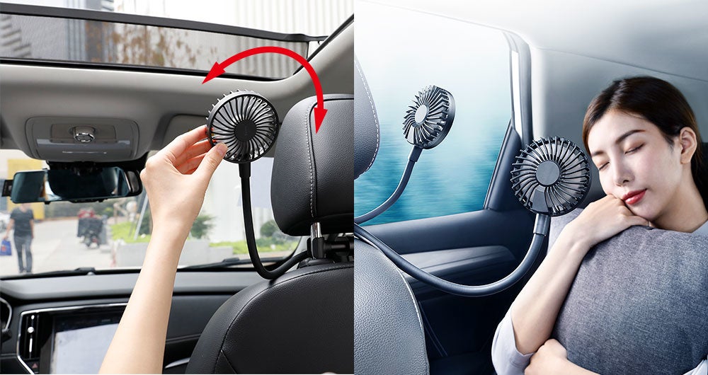 エアコンの直風が苦手な方も扇風機の自然な風で快適に過ごせる!好きな角度に自由自在、フレキシブルアームのヘッドレストツインファン「K-FAN09」新登場!