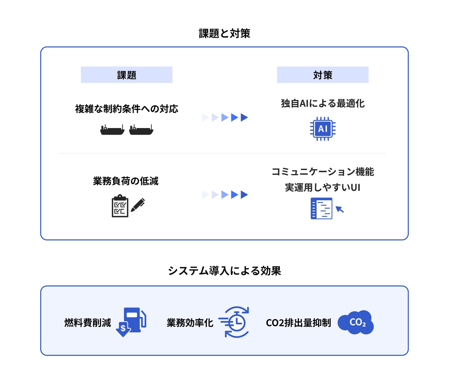ALGO ARTISは、これらの課題に対応するため、独自の最適化AI(アルゴリズム)を活用したソリューション「Optium(オプティウム)」の実証実験を行い、多くの隻数や拠点数が関わる複雑な内航船※3の配船計画最適化に成功しました。業務負荷を低減しつつ、運行効率を向上させることでCO2排出量の削減にも寄与することを実証しました。