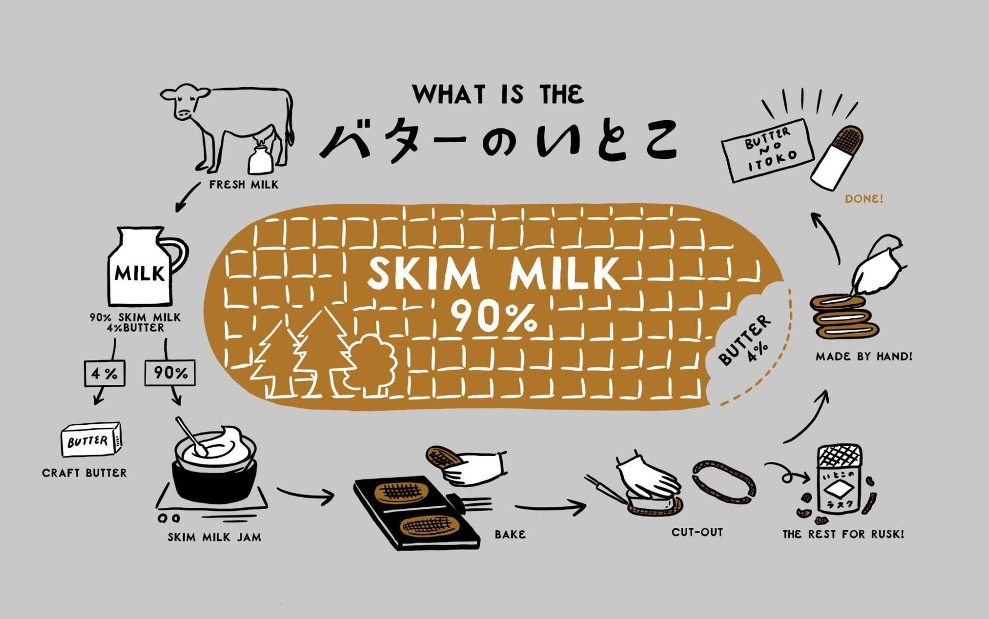 “ふわっ、シャリッ、とろっ”の3つの食感が楽しい「バターのいとこ」は、牛乳からバターを作る際に、その大半としてバターと共に生まれるものの、安価に販売されてしまう「スキムミルク」の価値を高めるために誕生したお菓子です。