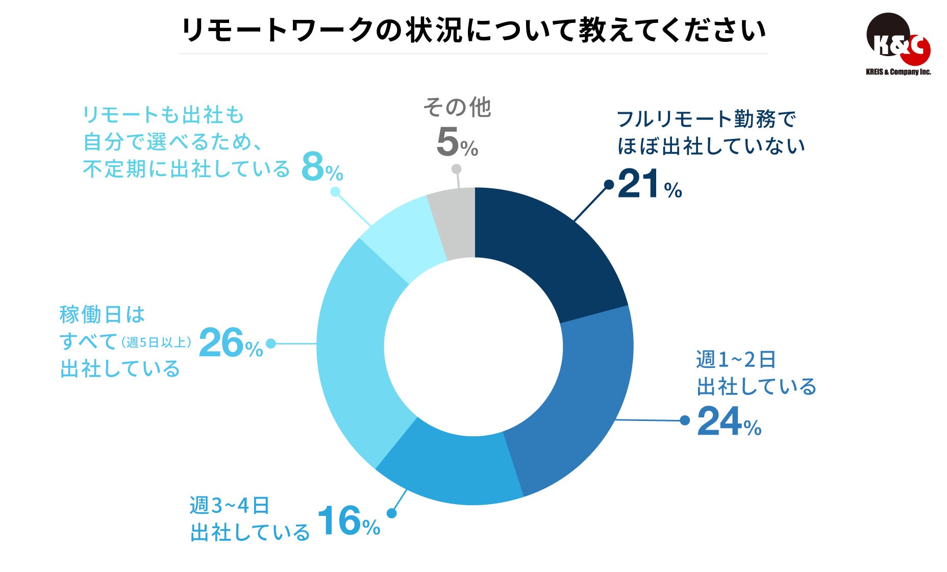 リモートワークの状況は「稼働日すべて出社」が26%で最多 「フルリモート」は21%に