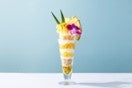 ハワイ名物のアイスケーキ「フラパイ」。パイナップルとココナッツのトロピカルカクテルを、ノンアルコールデザートに。