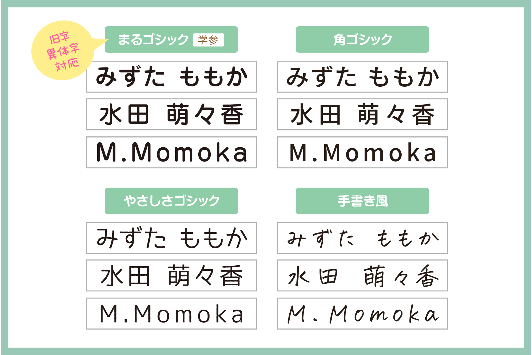 学参・旧字に対応した「まるゴシック」からかわいい「手書き風」まで、全4種類のフォントから選ぶことができます。大人でも使いやすいようにと新しい「手書き風」フォントを今回はじめて採用。お子さまが、高校生、大学生になってもシールDEネームの商品をご愛用いただければというキモチを込めています。