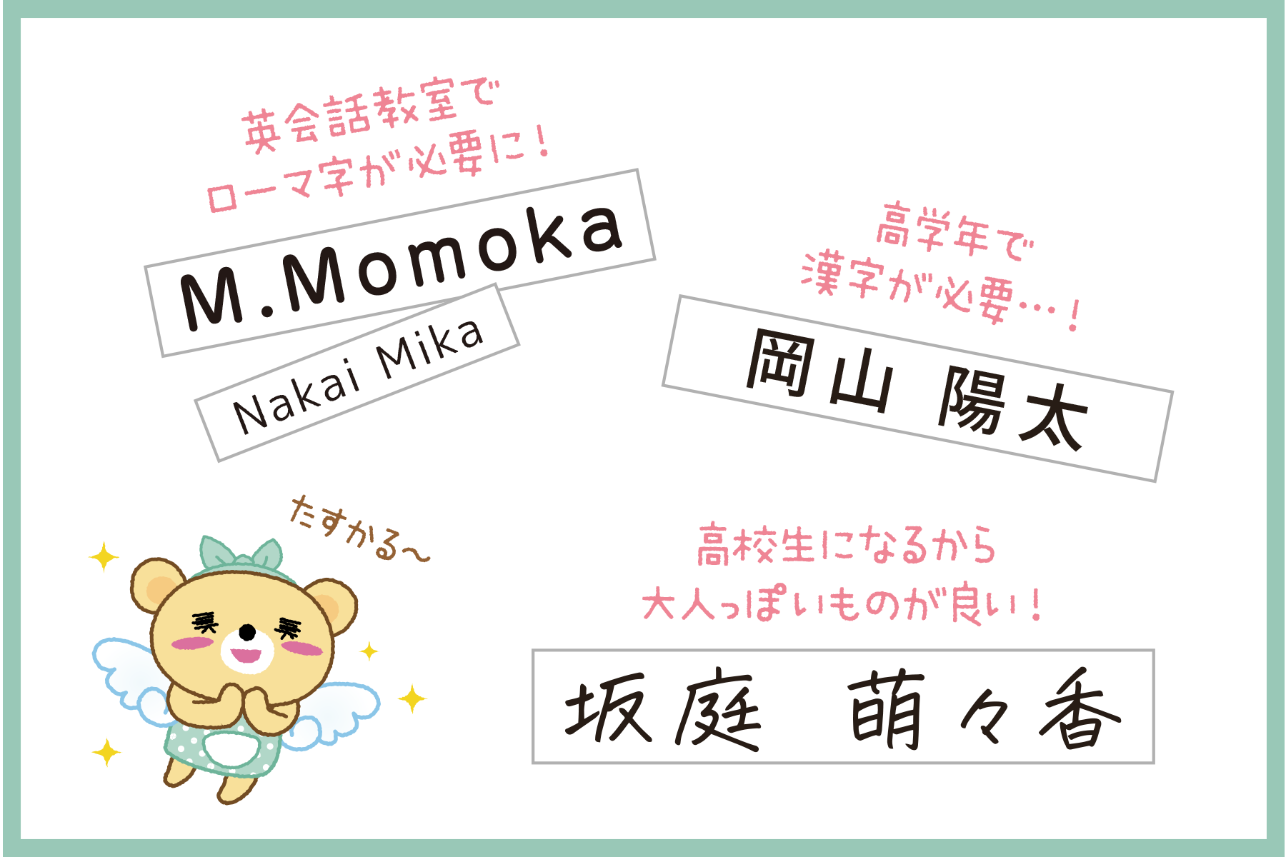ひらがな・漢字・ローマ字からお好きな文字を入れることができます。「英会話教室でローマ字が必要になった。」「小学校の高学年になったので漢字が欲しい!」など、“ちょっとあると便利”というシーンにオススメです。