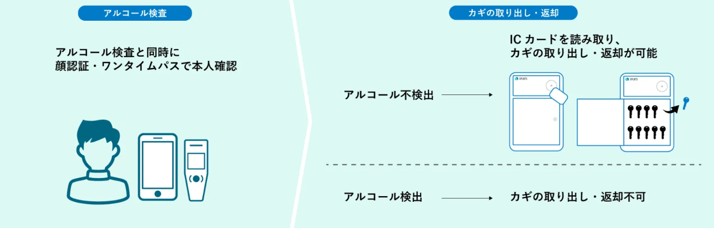 アルコールを検出しなかった場合のみ、キーボックスを開いて鍵を取り出すことが可能になります。個人ごとに 鍵の使用権限 を設定することも可能です。