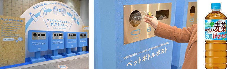 飲み終えたペットボトルをお持ちいただき、分別して『ペットボトルポスト』に投入いただいた方、先着500名様に100%リサイクルペットボトルの「GREEN DA・KA・RA やさしい麦茶」600mlを1本プレゼントいたします。