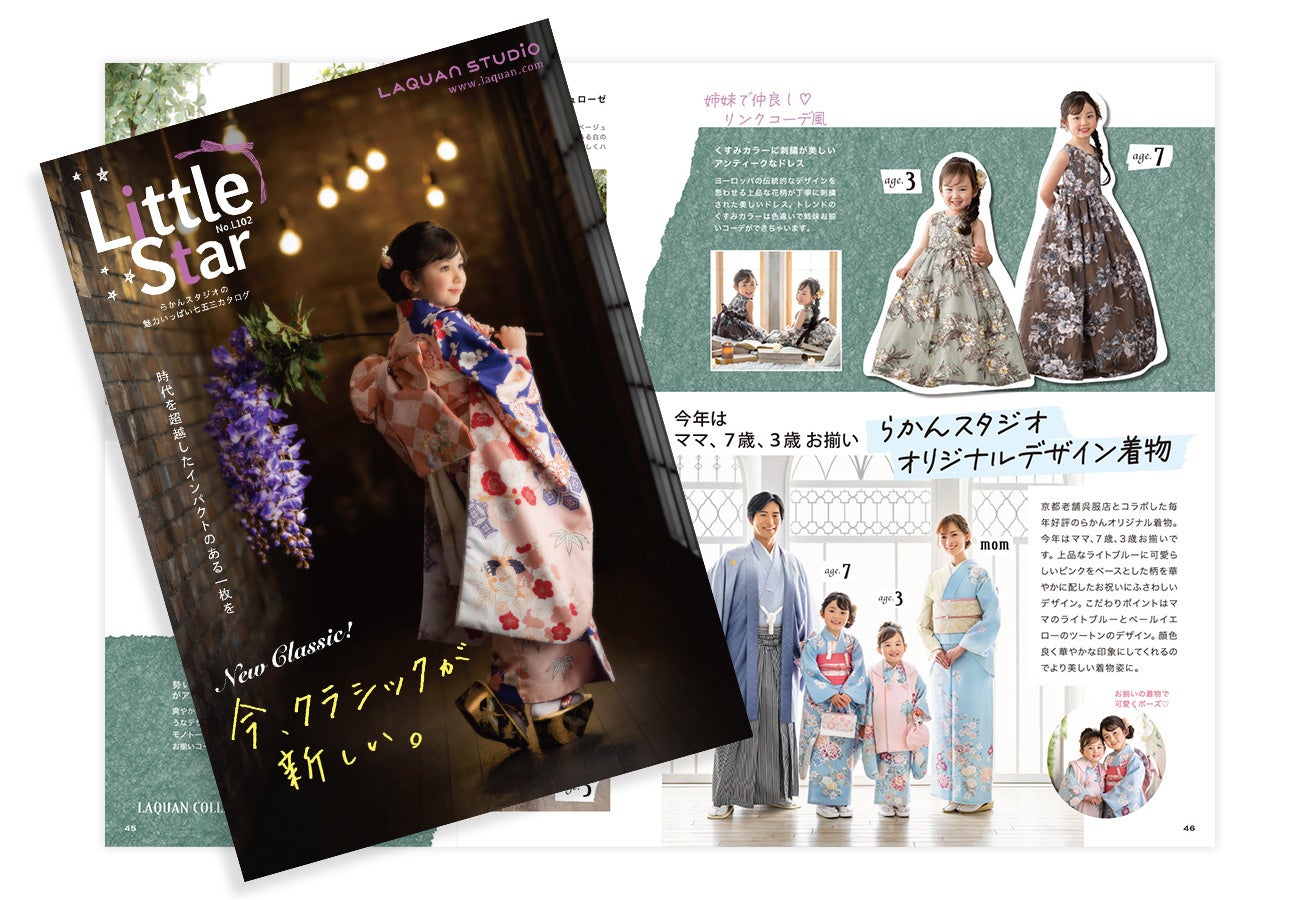 全国に26店舗の写真館を運営する株式会社らかんスタジオ(所在地:東京都三鷹市下連雀8-7-3、代表取締役 鈴木観)では、今年の七五三に向けて、京都の呉服店とコラボしたオリジナルの着物を仕立てました。毎年好評を集める、反物からデザインした質の高い着物は、4月末かららかんスタジオ各店に入荷されます。今年も、母娘や姉妹でお揃いコーディネートが楽しめる、華やかで品のあるオリジナル着物をご用意。新作衣装が見られる七五三カタログも配布中です。