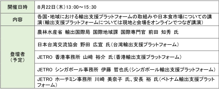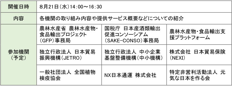 今回の開催では、国の施策において、国産農林水産物・食品の輸出市場開拓を重点的な取組みに位置付けられていることを踏まえ、出展者の輸出拡大を支援するための各種企画を予定しています。また、円安や物価高のほか、食料安全保障の観点でも、国産農林水産物・食品の重要性が高まっている状況を踏まえ、食品産業における国産原材料の利用促進に関するセミナーを実施します。