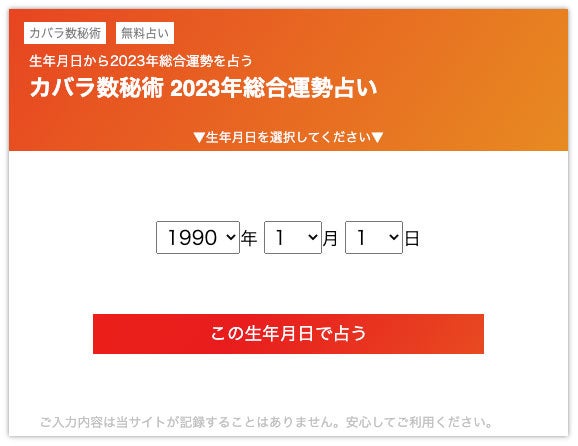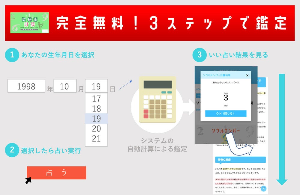 利用者は、生年月日を選択することで簡単に無料で占うことができ、本来、カバラ数秘術において算出が面倒な「運命数」を自動計算。それによって導き出された性格や特徴、運気を上げるためのワンポイントアイドバイスを受けることができます。