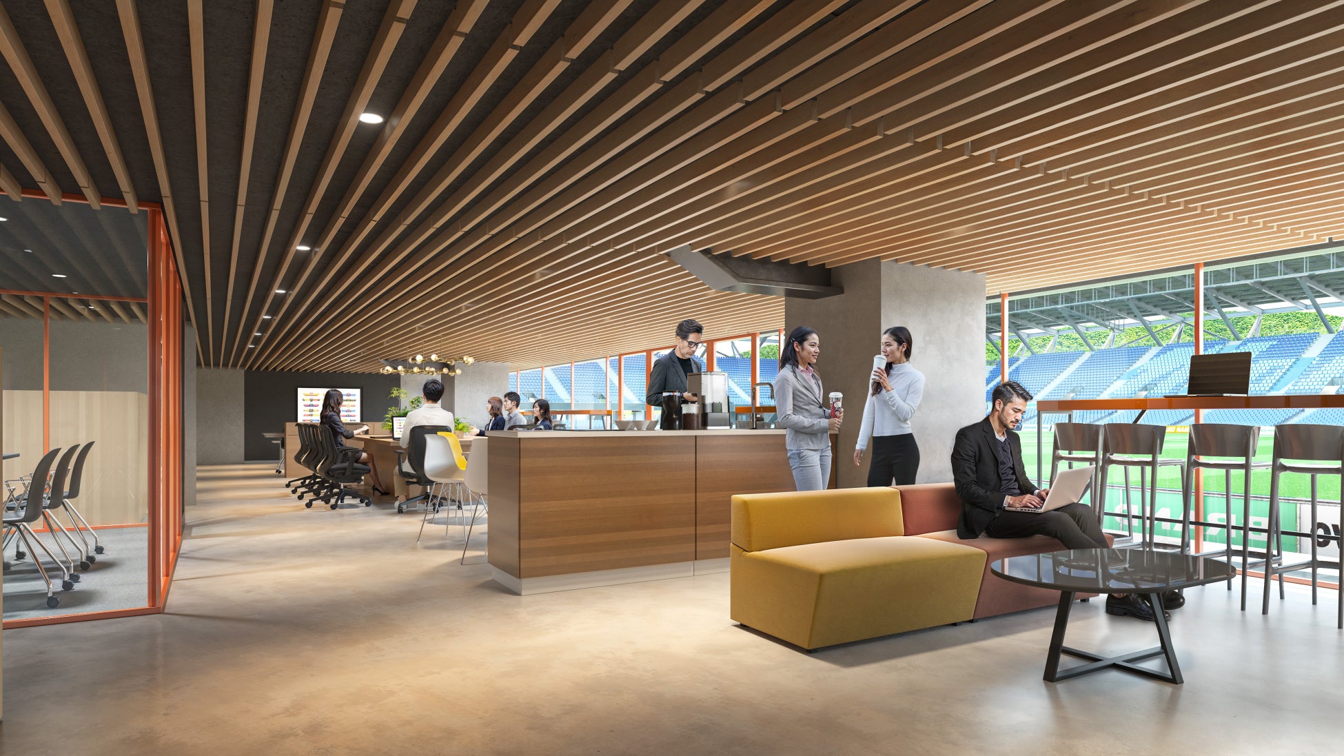 本構想では、年間を通して利用できるスタジアムを中心に、サッカーの試合だけでなく日常的な賑わいを生み出す多様な集客機能やシェアオフィスなどの産業育成機能を整備します。さらに、当社およびMY社は、行政や関係官庁等と連携しながら、地域の防災拠点としての役割や環境に配慮した社会インフラを導入することで、人口減少が進む中における地域の活性化や、若者の就労機会の増加など、山形県が抱える課題を解決し持続可能な地域社会の実現に寄与する「交流・文化発信拠点」の創出を目指します。