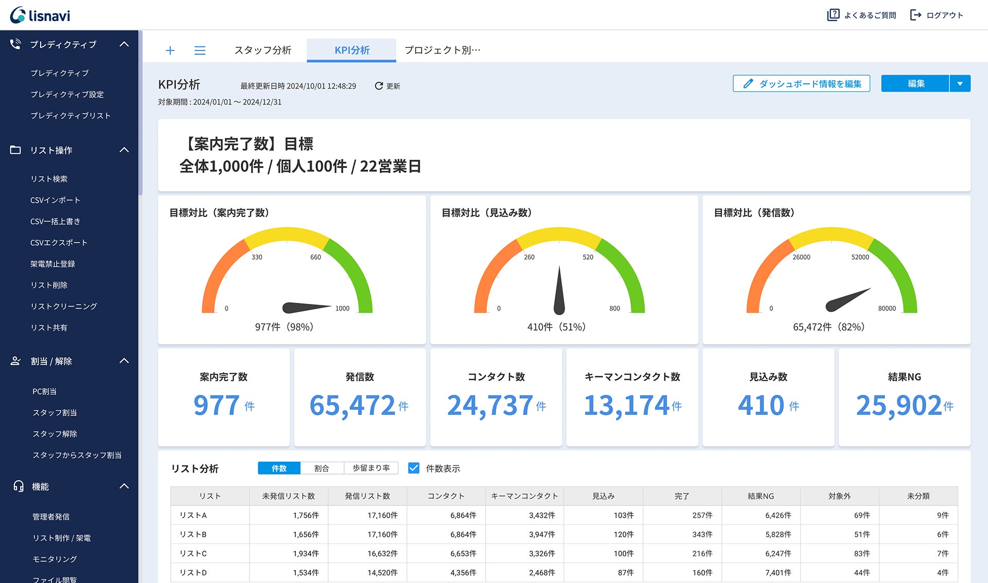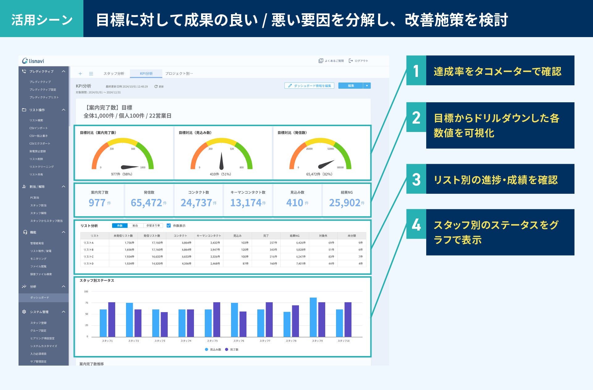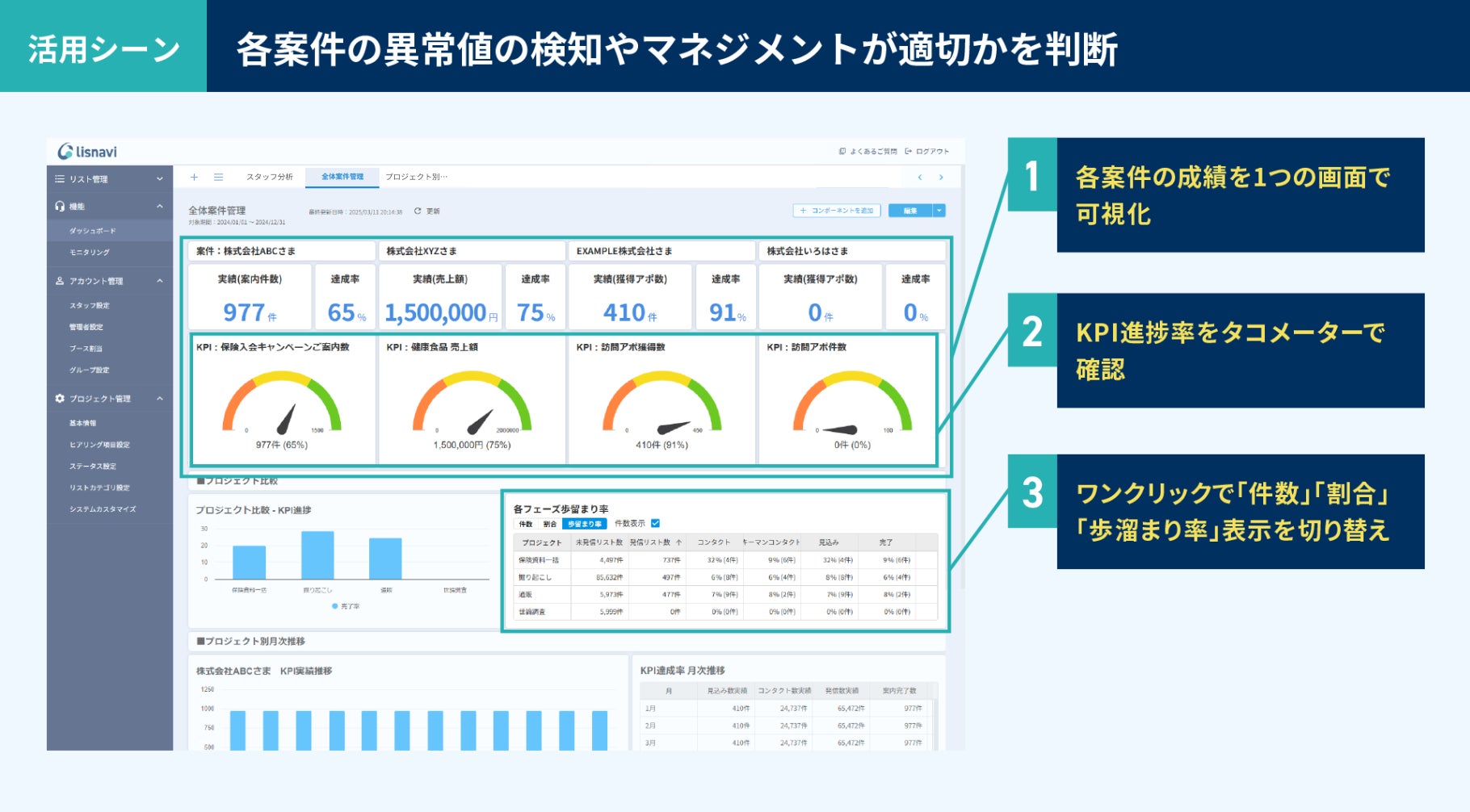 グラフ・表・メーター表示など多彩なコンポーネントで発信業務を可視化。自由に作成が可能なため、プロジェクトごとのKPI分析や、スタッフ成績分析など、目的に応じた数値管理を手軽におこなえます。