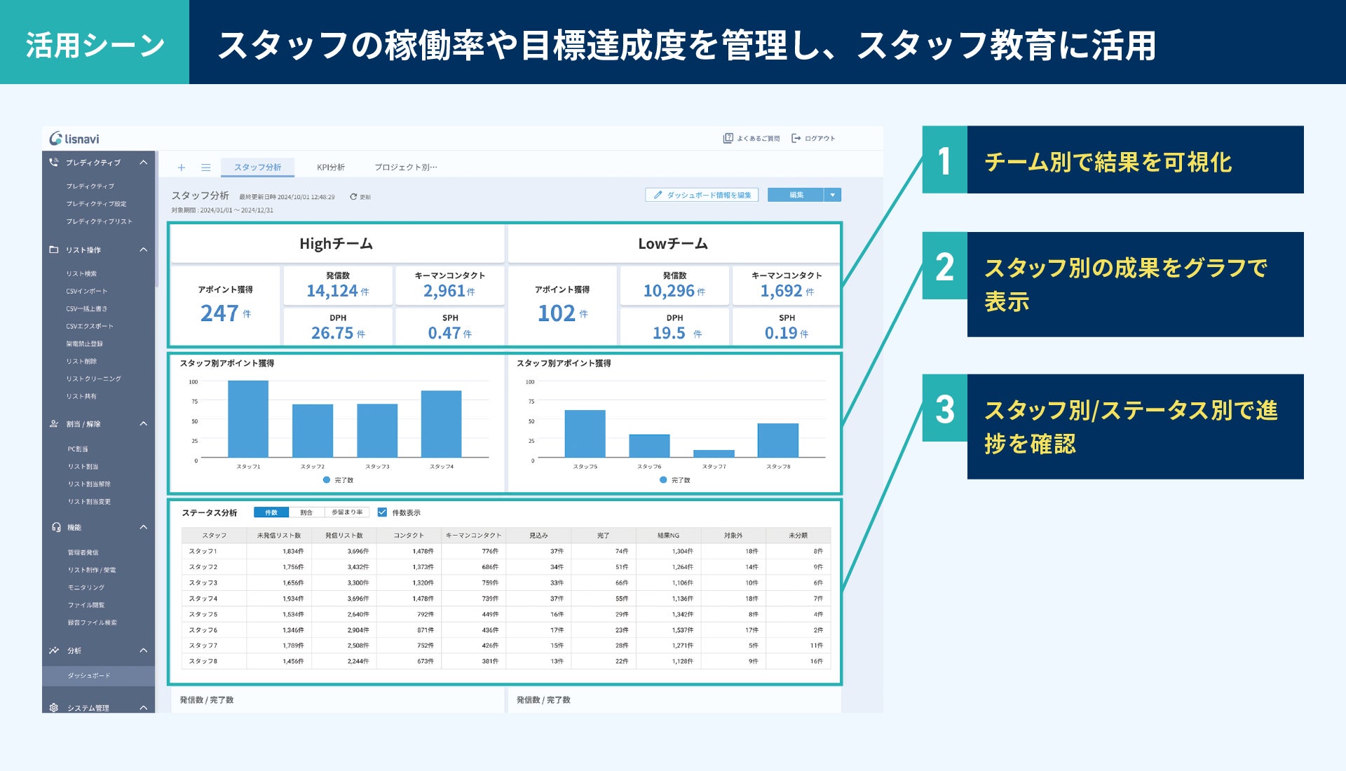 ●ニーズ:チーム別の稼働結果をダッシュボードで確認し、スタッフの状態を素早く把握したい