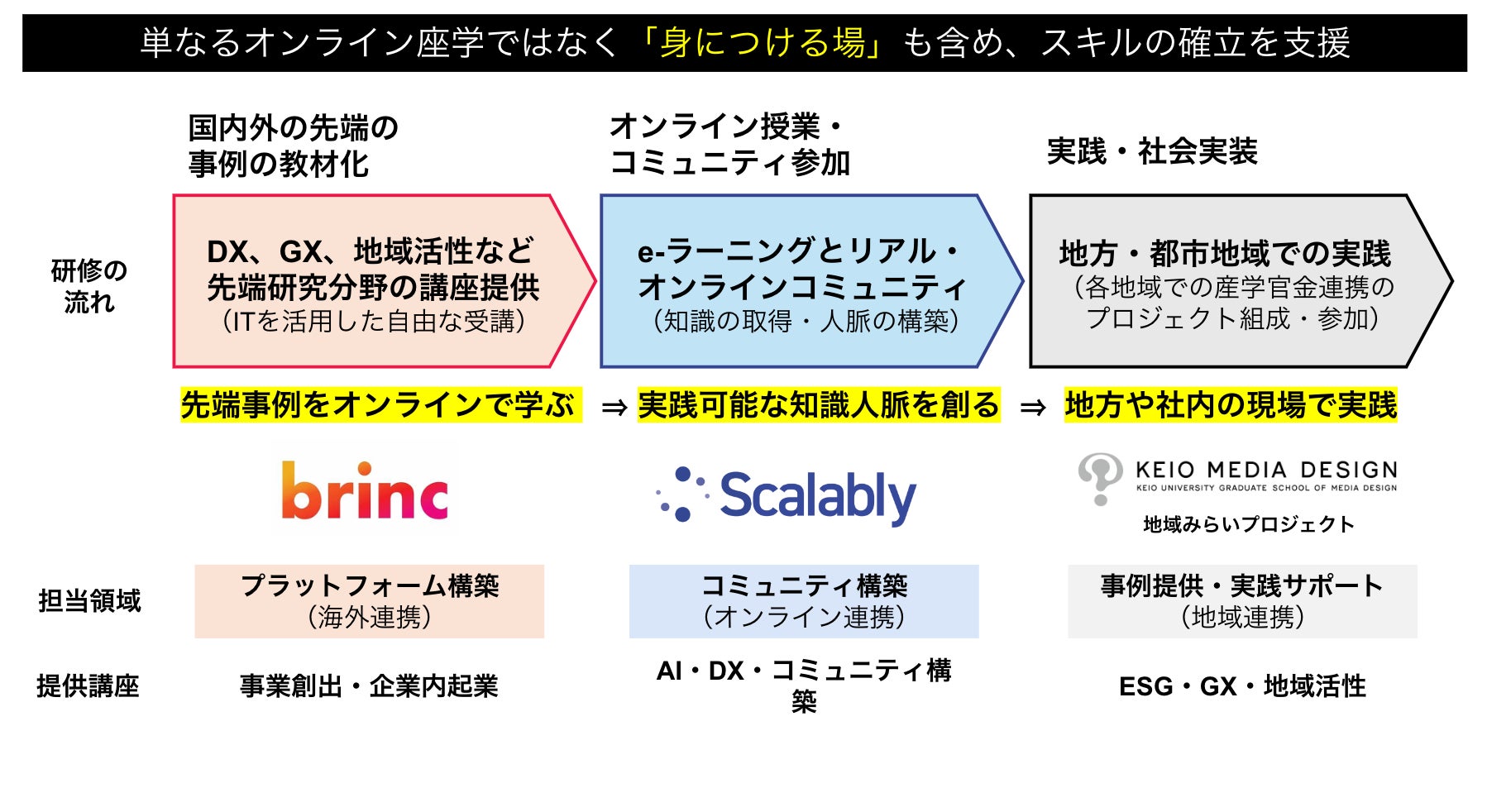 コミュニティを軸にし、全国の地方創生とグローバル市場の接続を推進するコミュニティマーケティングの専門企業Scalably株式会社(本社:東京都港区、代表取締役:山本 純矢、以下、 Scalably)は、香港を拠点に世界最大級のセクター特化型アクセラレーター・プログラムをアジア全域で展開し250社以上のスタートアップに投資を行っている世界的アクセラレーター「Brinc」の日本法人であるBrinc Japan株式会社(本社:東京都港区、代表取締役:岡澤 恭弥、以下、Brinc)によるオリジナルの起業家向け教育カリキュラム「Brinc Academy」を開発した知見と、産学官金連携で脱炭素対策(GX)や地方創生プロジェクトに取り組む慶應義塾大学大学院メディアデザイン研究科(横浜市港北区、研究科委員長:稲蔭正彦、以下、KMD)と共同で、事業成長につながる人材教育を目的にした企業向けの「リスキリング特別講座」の提供を開始します。企業の事業創出やESG対応、AIの事業利活用など、企業活動の市場変化への対応をeラーニングとリアルプロジェクトを通じた社会実装を通じて支援します。